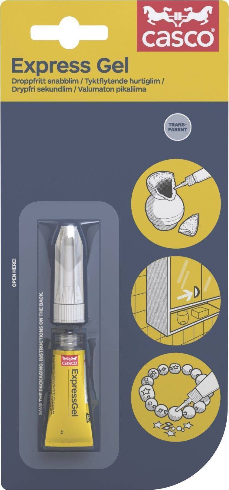 Casco ExpressGel on mitmeotstarbeline kiirliim väikeste esemete, näiteks metall, kivi, portselan, keraamika, kummi, jäik plastik, puit, kork, nahk, jms liimimiseks.
