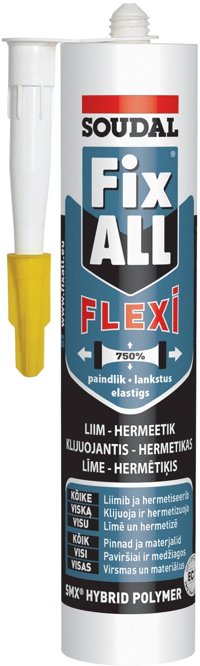 Soudal Fix-ALL FLEXI on tugevate liimivate omadustega kõrgekvaliteetne ühekomponentne MS-polümeeridel põhinev ühendushermeetik, mida on lihtne kasutada ja töödelda. Hea nakketugevus. Suurepärane nake enamusele aluspindadele ka märgades tingimustes. Ühendushermeetik on peaaegu lõhnatu, peale kõvenemist jäävalt elastne, värvuskindel ning vastupidav UV-kiirgusele. Ei jäta plekke poorsetele pindadele ega looduslikele kividele