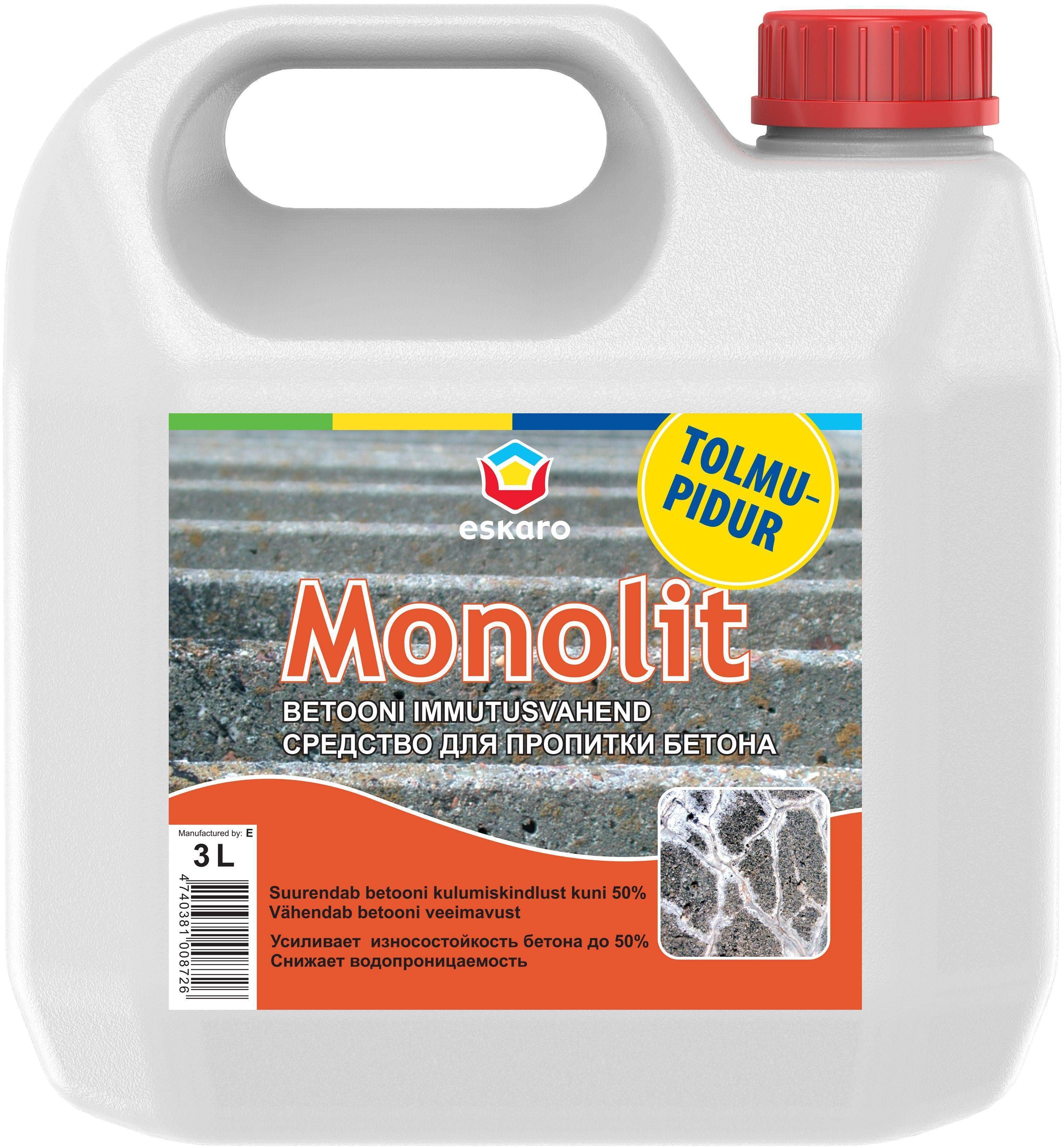 Eskaro Monolit immutusvahend betoonpindade kulumiskindluse suurendamiseks. Kasutuskohad: betoonpõrandad, -seinad tsehhides, töökojad, parklates. Sobib sise- ja välistöödeks. Kogus 3 l.