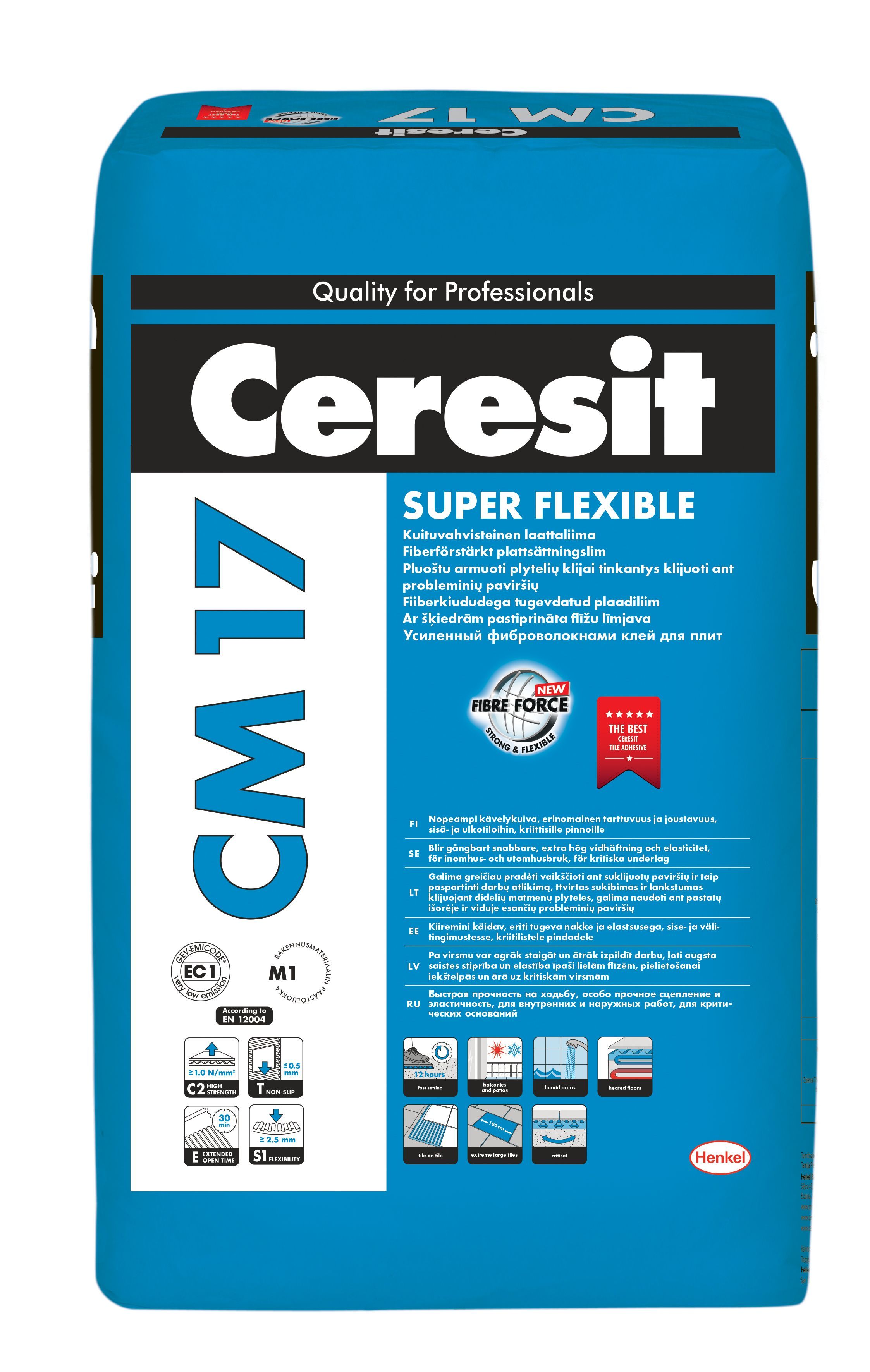 CERESIT® CM 17 on väga elastne kiududega tugevdatud plaadiliim, mis sobib keerukatele aluspindadele ja suurte plaatide paigaldamiseks. CERESIT CM 17 on kasutatav sise- ja välistingimustes ning sobib kasutamiseks märgades ruumides ja basseinides. Segu CERESIT CM 17 omadused tagavad elastse ühenduse aluspinnaga ja plaadi ning aluspinna vaheliste survepingete hajutamise. Seetõttu soovitatakse CERESIT CM 17 plaatide kinnitamiseks painduvatele lükandseintele, köetavatele põrandatele, fassaadidele, rõdudele ja terrassidele, samuti basseinidesse ja tehnoloogilistesse veemahutitesse.