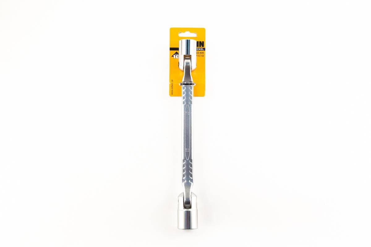 Liigendiga padrunivõti, kumbki ots eri padrunisuurusega. Padrunid on 12-kant MAX-kinnitusega ja 180° pööratavad. Kroomvanaadiumterasest. 10-aastane garantii. Padrunisuurused: 21x23 mm.