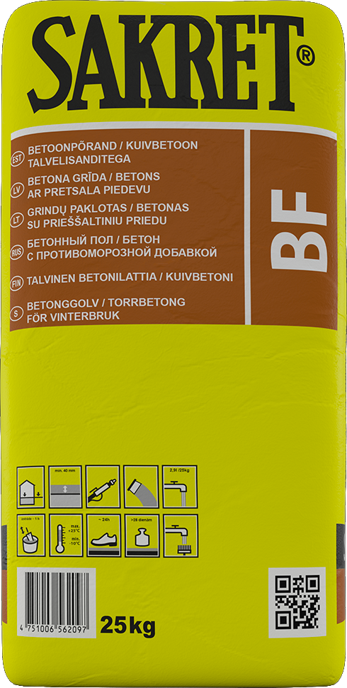 Sakret BF on külmumisvastase lisandiga kuivbetoon / betoonpõrand, mis on kasutamiseks kuni -10°C külmaga. Sobilik erinevate betoonivalutööde jaoks (nt. postid, monoliitelemendid, põrandad jms). Võimalik kasutada köetavate põrandate valamiseks.