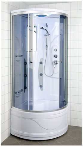 • Kõrge alusvanni, liuguste ja katusega massaažikabiin, mille mõõtmed on 92 x 92 cm, kõrgus 217 cm. • Klaasid on 6 mm toonitud turvaklaasist, alumiiniumprofiil värvitud hõbedane. • 6 seljamassaaži düüsi, segisti, üla- ja käsidušš. Lisaks valgustus, peegel, riiul, dušilift ning istekoht. • Metallraamil valge akrüülvann, mille kõrgus on 45 cm. • 14-päevane tagastusõigus.