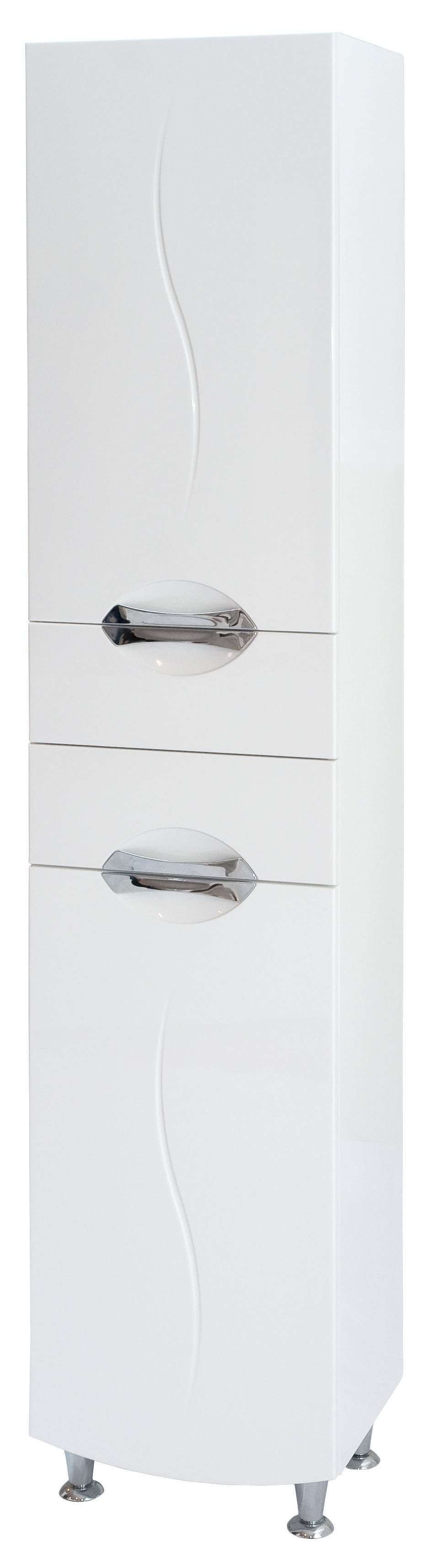410 x 320 x 1950 mm, kahe vaikselt sulguva uksega ja kahe sahtliga, paremakäeline, valge, niiskuskindel MDF, komplektis neli kroomitud metalljalga