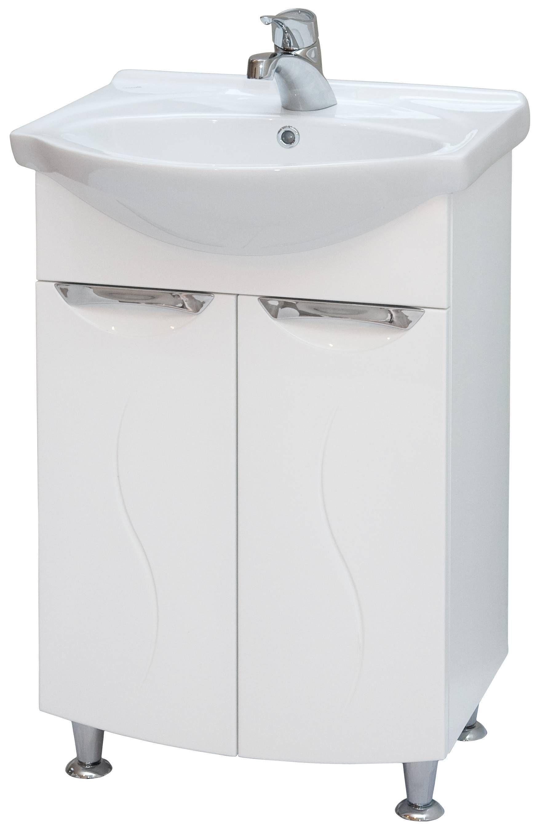 550 x 450 x 850 mm, kahe vaikselt sulguva uksega, valge, niiskuskindel MDF, komplektis keraamiline valamu Evita ja neli kroomitud metalljalga. Segisti ei kuulu komplekti.