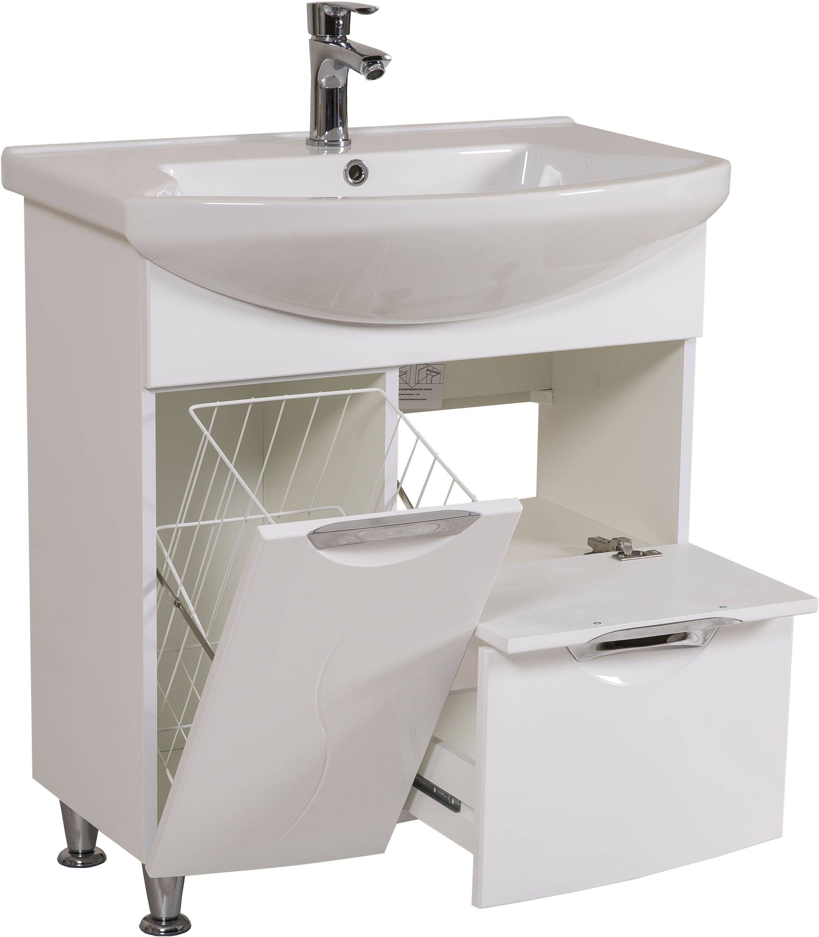 Nordik stiilis keraamilise valamuga Aquarodos vannitoakapp Gloria vaikselt sulguva uksega. Kapp on valge värvusega ja mõõtmetega 75 x 51 x 85 cm. Komplekti kuulub keraamiline valamu Evita 75 cm, valge värvusega. Kapil on neli kroomitud metalljalga, kaks väljatõmmatavat sahtlit ja väljapoole avanev kapiuks, mille külge on kinnitatud pesukorv. Kapp on valmistatud niiskuskindlast MDF puitlaastplaadist. Tarnitakse kokkupanduna.