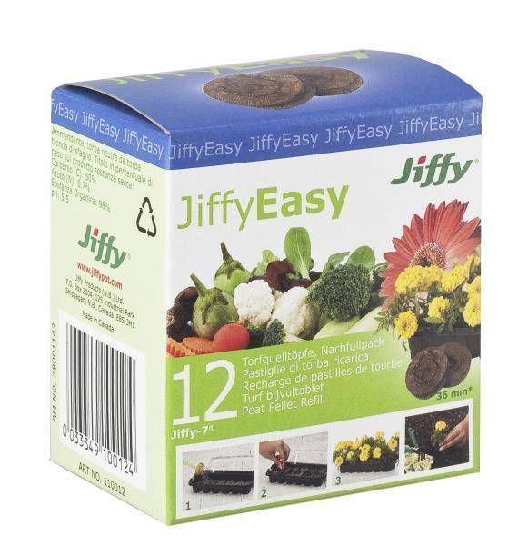 Jiffy turbatabletid läbimõõduga 36 mm. Kokkupressitud turbasegu võrgus, toasooja vett lisada 50 ml tableti kohta. Paisunult läbimõõt 40 mm, kõrgus 42 mm. Ph 5,1-5,5. Võrk võimaldab juurtel segamatult areneda, ideaalne vee ja õhu läbitavus. Lihtne ja puhas kasutada. Pakendis 12 tk.