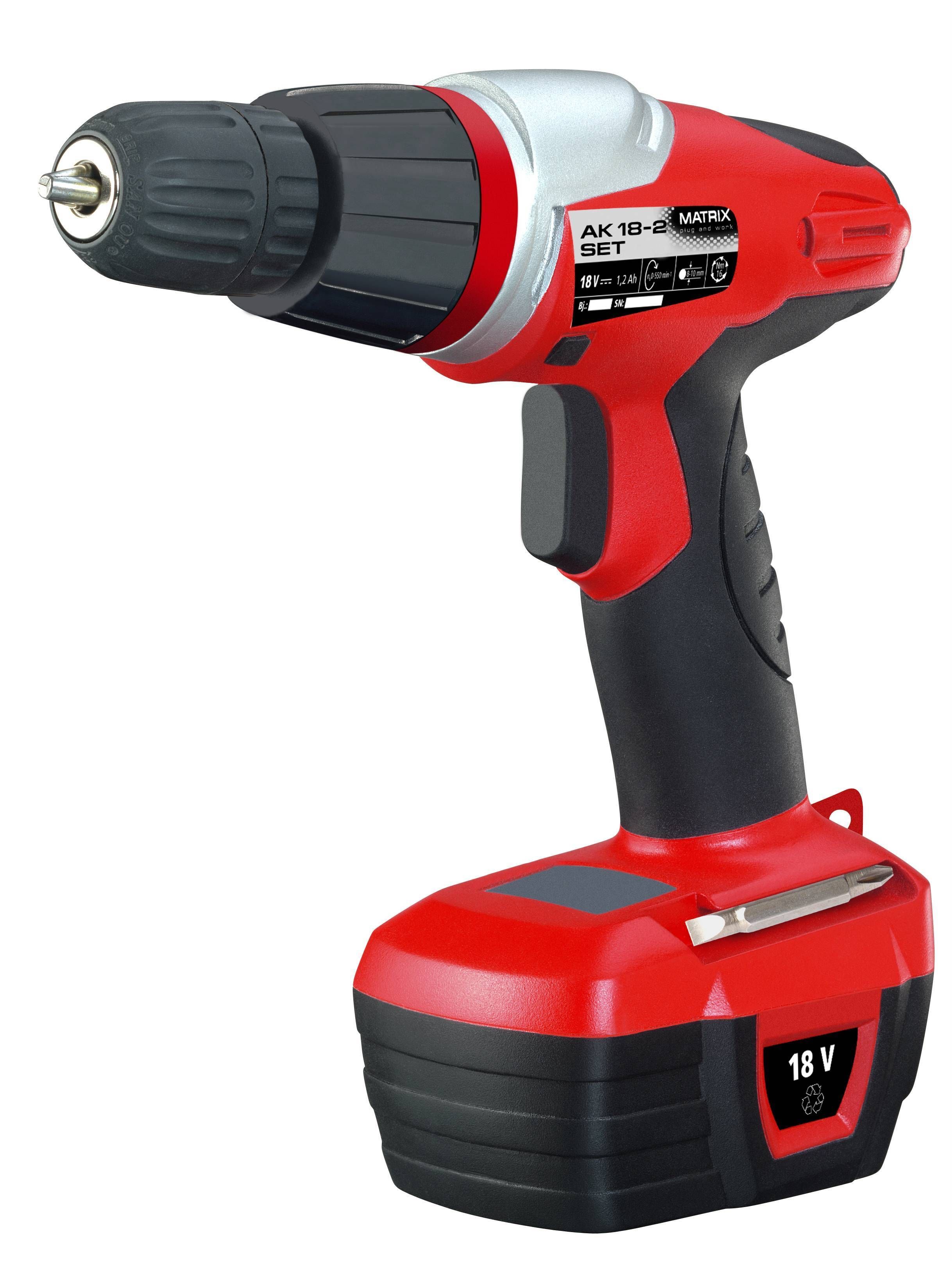 Laetav aku NiCd 2 x 18 V aku, 1.2 Ah Päripäeva/vastupäeva pöörlemine Elektrooniline kiiruse kontroll Kiirpadrun 10 mm Laadimisaeg 3 - 5 h Pöördemoment 16 Kohvris Tühikäigul 0 - 550 p / min