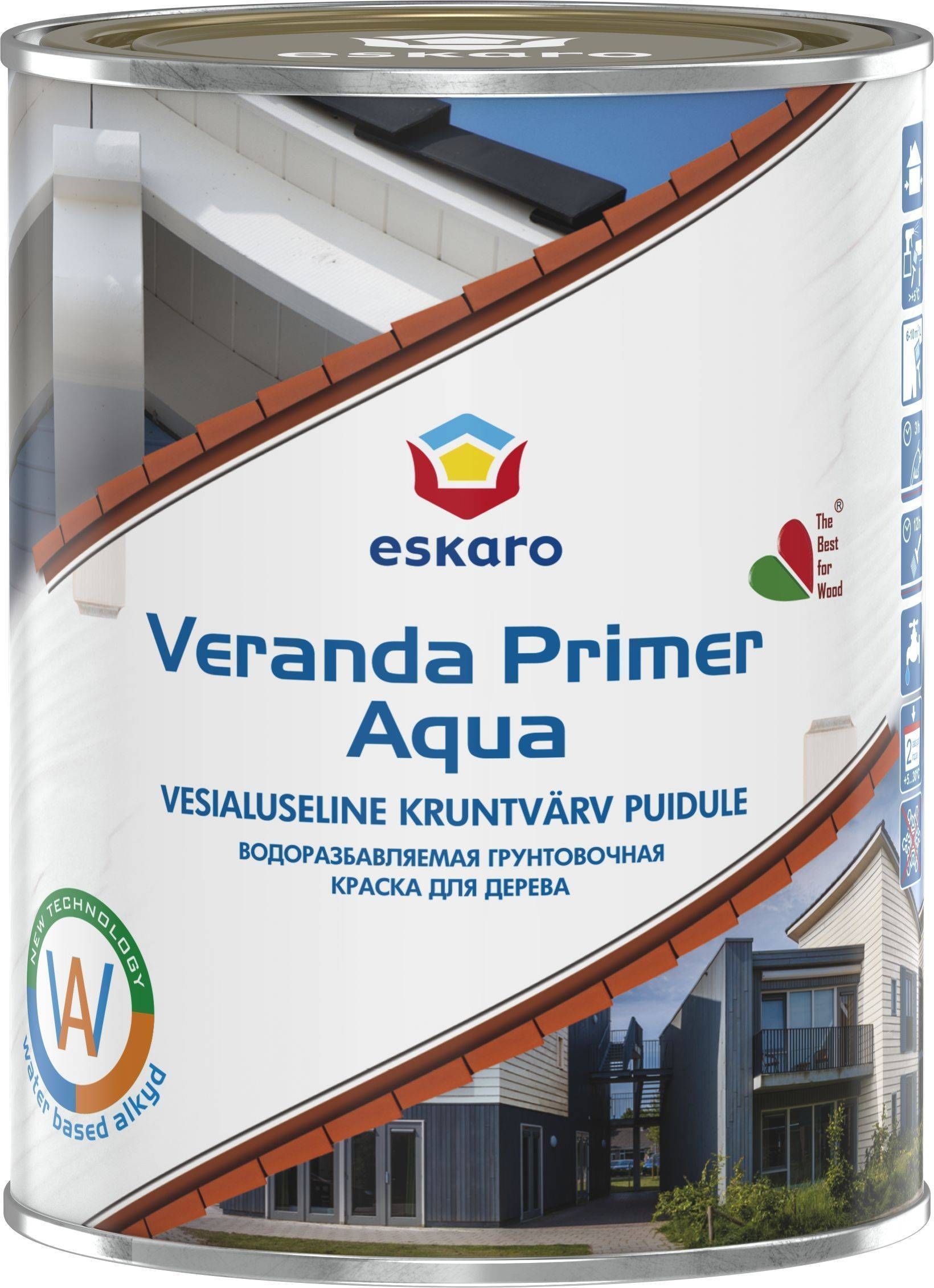 Eskaro Veranda Primer Aqua on valge matt vesilahustuv alküüdvärv puitpindade kruntimiseks ja värvimiseks välistöödel. Kasutatakse puitpindade kruntimiseks enne vesidispersioon-, alküüd- ja õlivärvidega värvimiseks välistöödel (puitfassaadid, voodrilauad jm). Sobib aedade, puukuuride jt. abihoonete värvimiseks.