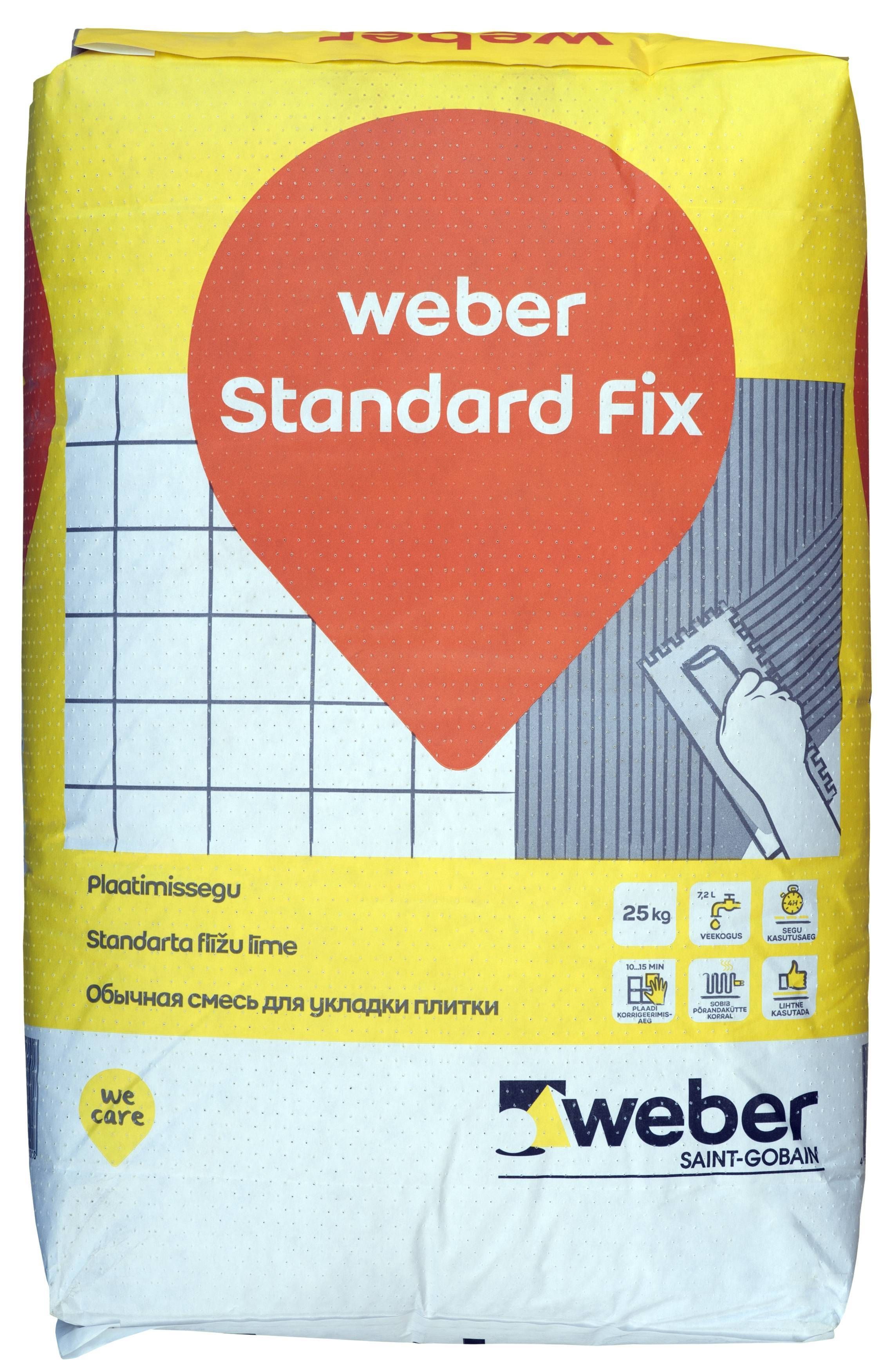 Weber Standard Fix on tsemendil baseeruv plaatimissegu, mis on mõeldud keraamiliste, klinker- ja mosaiikplaatide paigaldamiseks põrandatele ja seintele. Sobib kasutamiseks nii kuivades kui märgades ruumides ja põrandakütte korral, kuid mitte hüdroisolatsiooni peal. Segu valmistamisel kasutatakse ainult puhast vett. Veekulu on 7,2 l/25 kg kohta. Valmissegatud plaatimissegu kasutusaeg on 4 tundi vee lisamisest. Segu pealekandmisel tuleb arvestada selle töötlemis- ja tardumisaega, seetõttu kanda segu ainult nii suurele pinnale, mida jõuab 10-15 minutiga plaatida (segu avatud aeg u 20 min). Materjali kulu on 3 kg/m. Kuivamisaeg 1-2 ööpäeva. Segu säilib kuivades oludes kinnises pakendis 12 kuud tootmiskuupäevast. Pakendi kogus 25 kg.