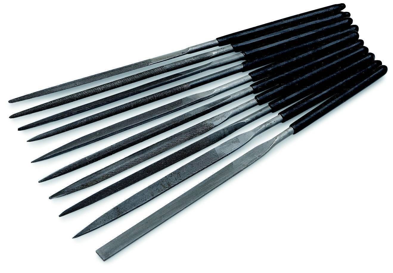 10-osaline nõelviilikomplekt. Plastkattega käepidemed. Ümarad, poolümarad, kolmnurksed, nelikant- ja lameviilid. Pikkus 140 mm.