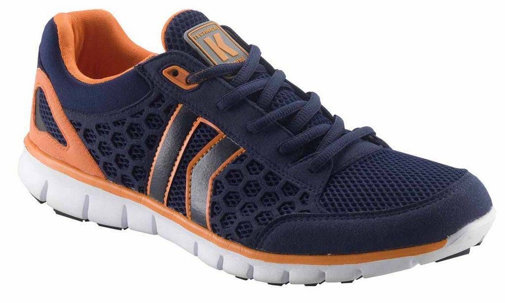 Ülikerge, õhku läbilaskev. Painduva põrutust absorbeeriva tallaga vabaajajalats. Suurused 40-46. Värv tumesinine/oranž.