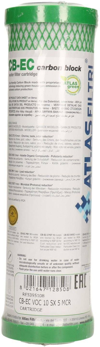 Aktiivsöest pressitud filtrielement CB-EC parandab vee maitset ja lõhna, vähendades kloori, pestitsiidide, bakterite ning teiste orgaaniliste ja oksüdeerivate ainete sisaldust vees. Soovitatav elemendi kasutusaeg 3-6 kuud. Elemendi pinna kaitseks on soovitatav kasutada eelfiltrit (5µ). Element ei ole korduvkasutatav. Kasutusvaldkond on külma tarbe- ja joogivee filtreerimine.