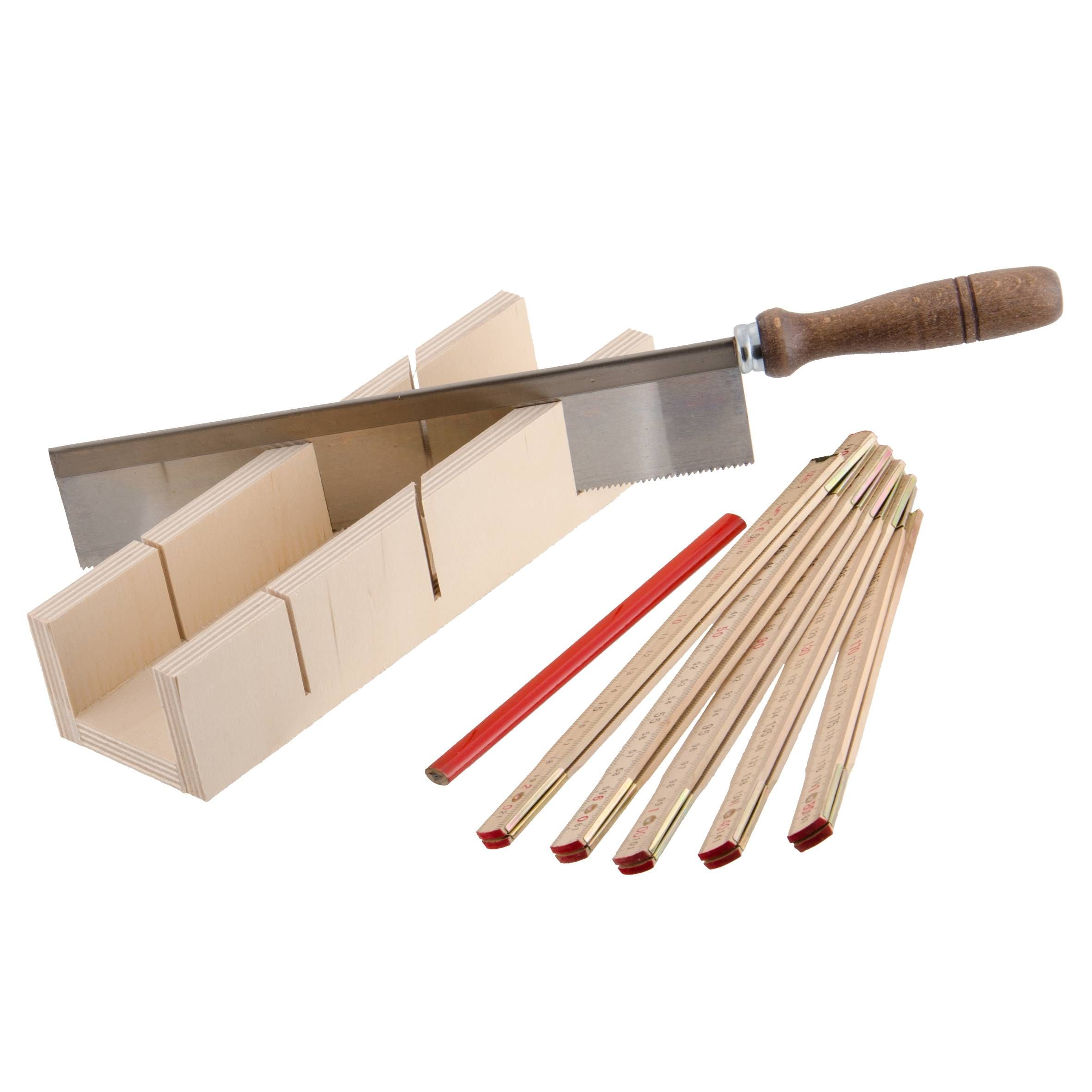 • Puidust rakis sirgelt (90°) ja nurkade lõikamiseks (45°) ja saag, mille tera pikkus on 250 mm. • Lisaks on komplektis pliiats ja puidust kokkupandav tollipulk. • 14-päevane tagastusõigus.