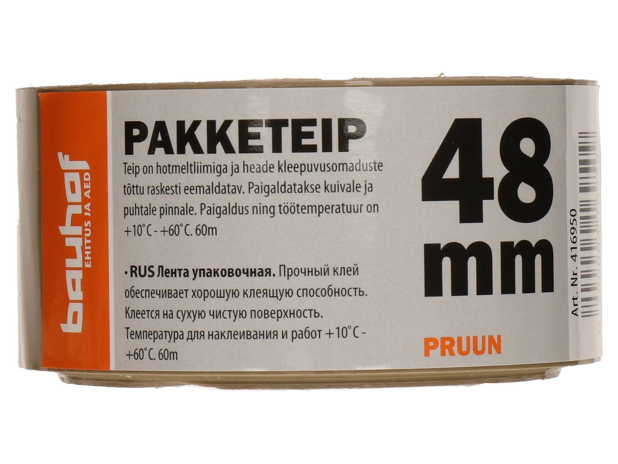 Bauhofi pruun pakketeip on hotmeltliimiga ja heade kleepuvusomaduste tõttu raskesti eemaldatav. Paigaldatakse kuivale ja puhtale pinnale. Paigaldus- ning töötemperatuur on + 10°C - +60°C. Teibi pikkus 60 m, laius 48 mm. Sobib sisetingimustesse.