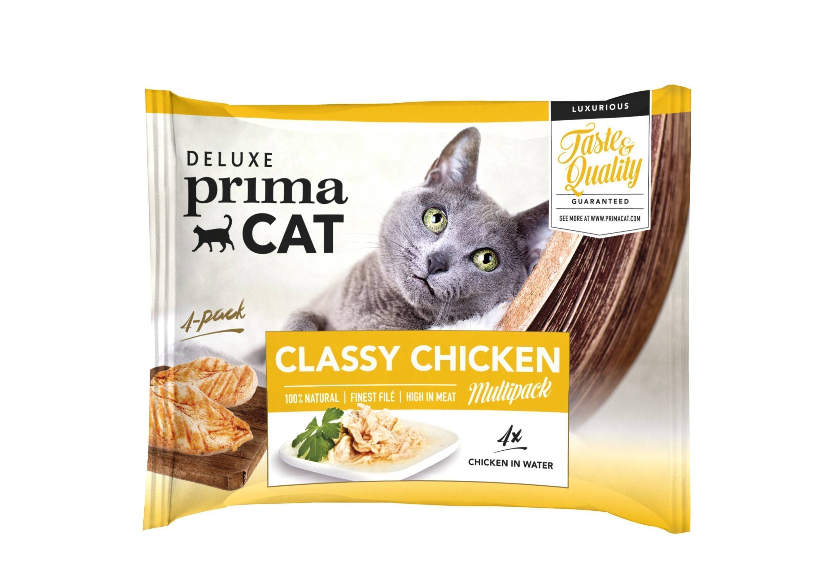 Deluxe PrimaCat kiisueinete mahlane liha teeb su lihasööja õnnelikuks. Nendes maitsvates kiisueinetes pole lihafileega koonerdatud: mahlane kana rinnafilee moodustab kuni 70% paki sisust.Lisaks on kõik selle kiisueine koostisosad 100% looduslikud, ilma sünteetiliste värvi-, lõhna-, maitse-, või säilitusaineteta. Kiisueinete maitsev liha viib kassil keele alla. Seepärast annamegi toodetele 100% maitse- ja kvaliteedigarantii. Erinevad hõrgutavad maitsed on saadaval praktilistes multipakkides. Kiisueine pakk sisaldab 4 x 50 g.