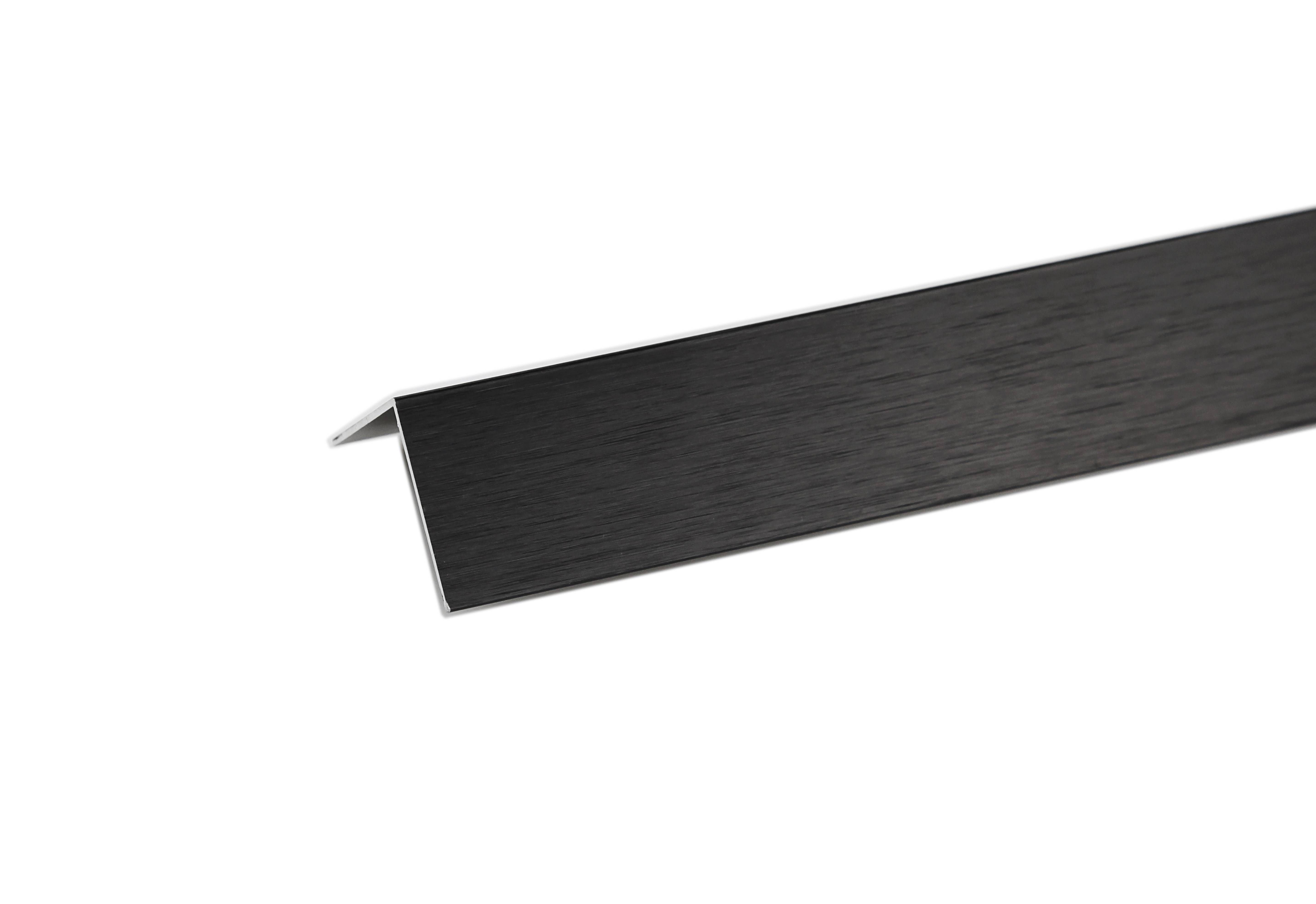 Arcansase alumiiniumist L-profiil harjatud musta viimistlusega ja mõõtmetega 1000 x 20 x 10 x 1 mm.