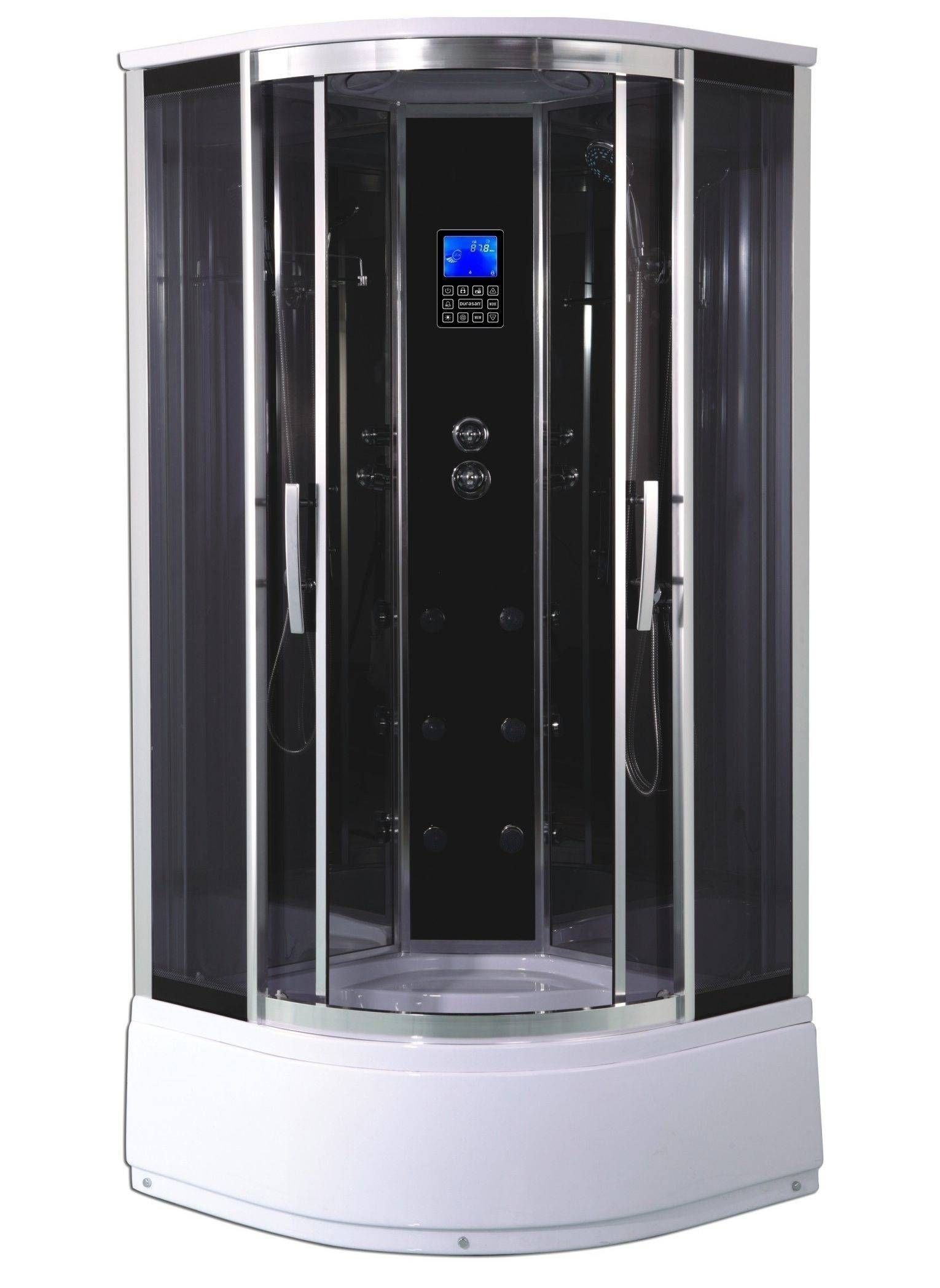 • Kõrge aluse, liuguste ja katusega massažikabiin, mille mõõtmed on 90 x 90 cm, kõrgus 220 cm. • Uksed 6 mm ja esisein 4 mm toonitud grafiit turvaklaasist, tagasein 4 mm peegelklaasist. Värvitud alumiiniumprofiil, kroom. • 6 seljamassaaži düüsi, segisti, üla- ja käsidušš. Lisaks Soft Touch juhtpult, valgustus, raadio, ventilaator, riiul, peegel ning istekoht. • Metallraamil valge akrüülvann, mille kõrgus on 44 cm. • 14-päevane tagastusõigus.