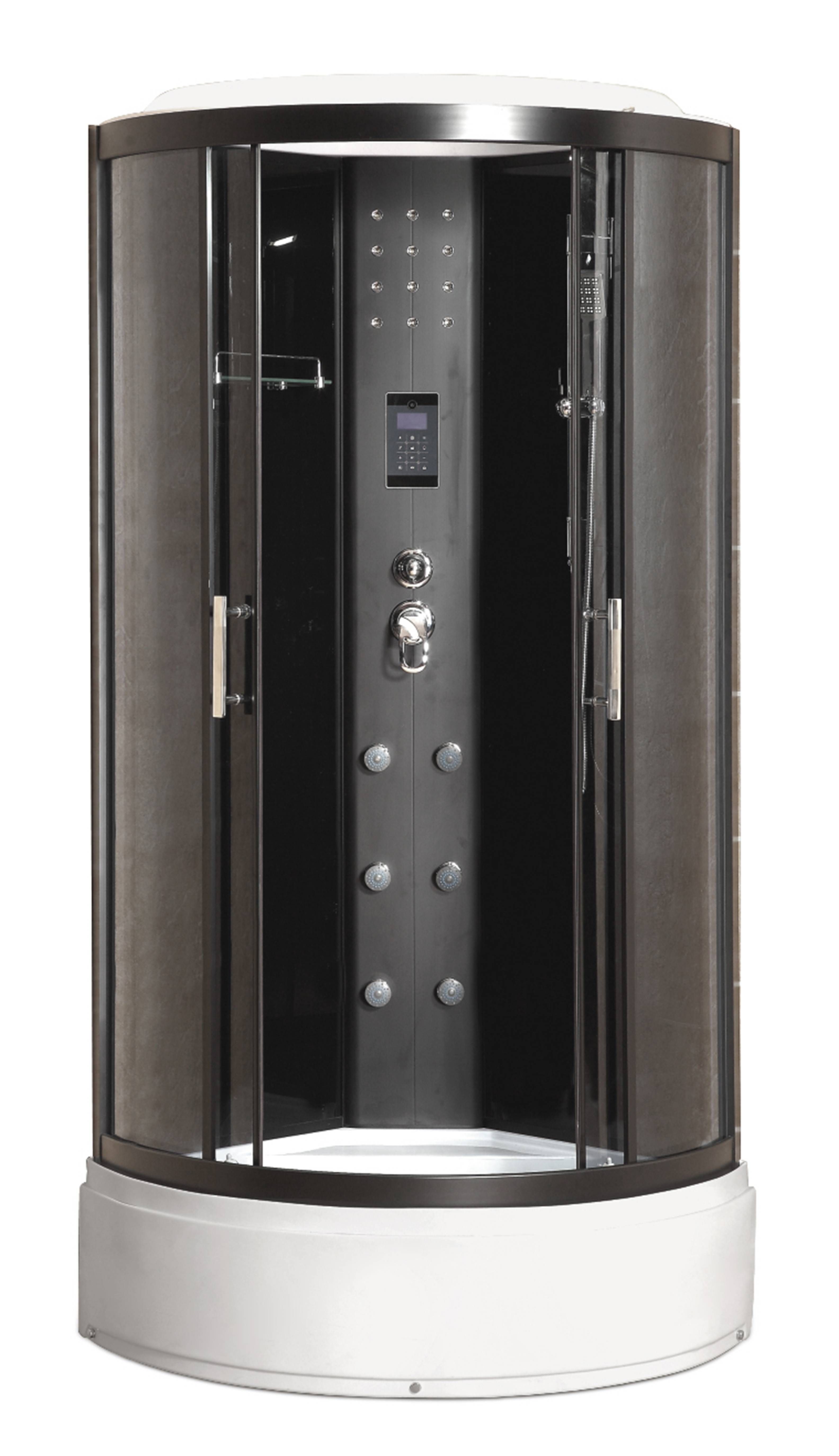 • Kõrge alusvanni, liuguste ja katusega massaažikabiin, mille mõõtmed on 90 x 90 cm, kõrgus 230 cm. • Uksed ja esisein on 4 mm toonitud grafiit turvaklaasist, tagasein 4 mm toonitud must turvaklaasist. Alumiiniumprofiil värvitud, matt must. • 6 seljamassaaži düüsi, segisti, üla- ja käsidušš. Lisaks juhtpult, valgustus, raadio, ventilaator, dušilift, riiul ning istekoht. • Metallraamil valge akrüülvann, mille kõrgus on 31 cm. • 14-päevane tagastusõigus.