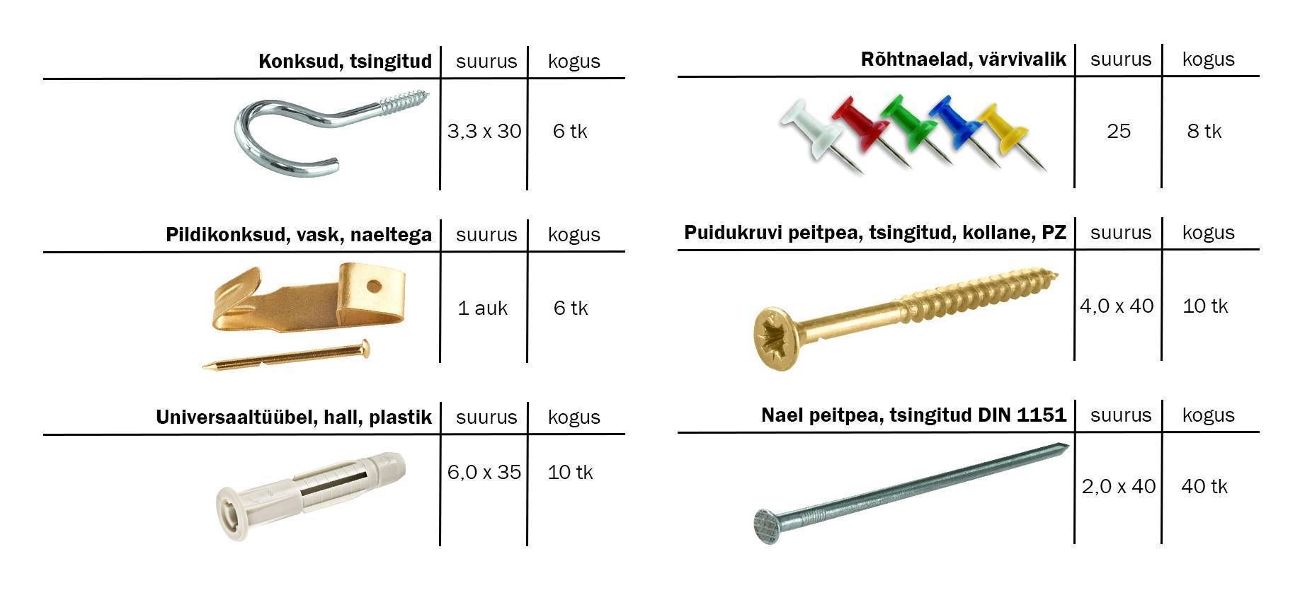 • Sisaldab peitpea puidukruvi PZ, universaaltüübelid, tsingitud konkse, värvivalik rõhtnaelu, vasest naeltega pildikonkse, peitpea naelu