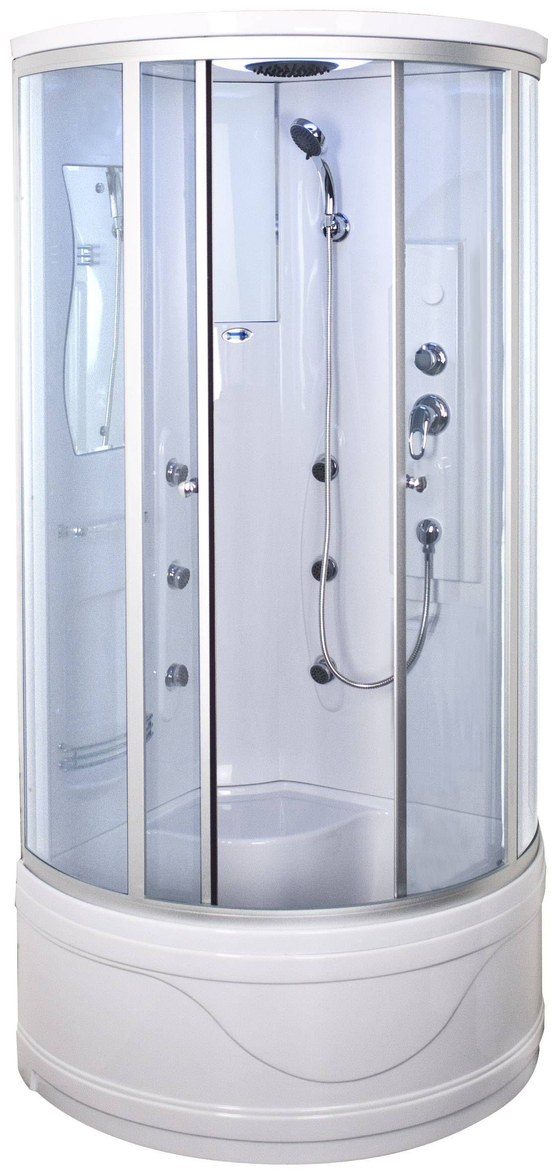 • Kõrge alusvanni, liuguste ja katusega massaažikabiin, mille mõõtmed on 92 x 92 cm, kõrgus 217 cm. • 6 mm kirkad turvaklaasid. Värvitud alumiiniumprofiil, hõbedane. • 6 seljamassaaži düüsi, segisti, üla- ja käsidušš. Lisaks värvimuutev LED-valgustus, peegel, riiul ning istekoht. • Metallraamil valge akrüülvann, mille kõrgus on 45 cm. • 14-päevane tagastusõigus. • HANKIJA LAOST TELLITAV TOODE