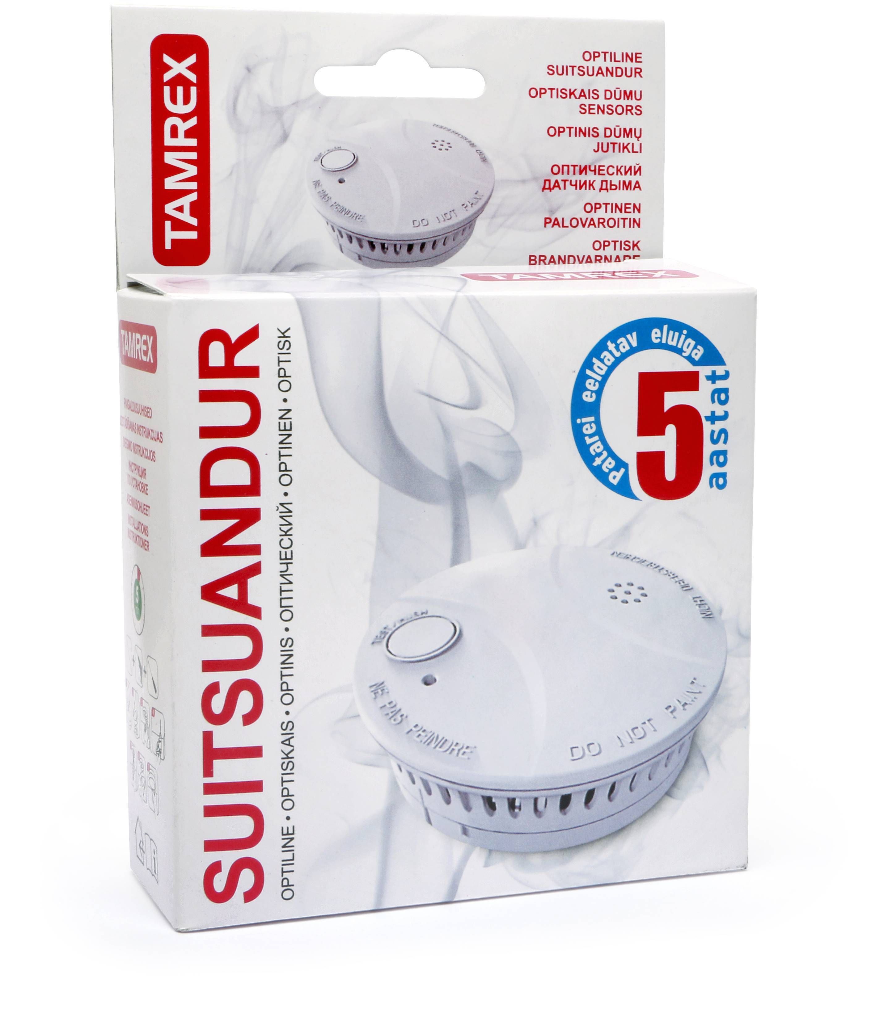 Optiline suitsuandur, mis on varustatud CR123A liitiumpatareiga, mille eeldatav eluiga on 5 aastat. Suitsuandur reageerib nähtavale suitsule ning annab märku tugeva helisignaaliga. Suitsuandur peaks olema (nii kodus, kui suvilas) igas eluruumis, kindlasti igas magamistoas ja koridoris. Mitte paigaldada kööki ja pesuruumi, kus võivad tekkida valehäired. CR123A liitiumpatarei eeldatav eluiga on 5 aastat, ning annab tühjenedes helisignaaliga märku. Suitsuandur paigaldada toa keskele lakke. Kontrollala max 60 m² avatud ruumides. Garantii 3a. Vastab standardile EN14604:2005+AC:2008.