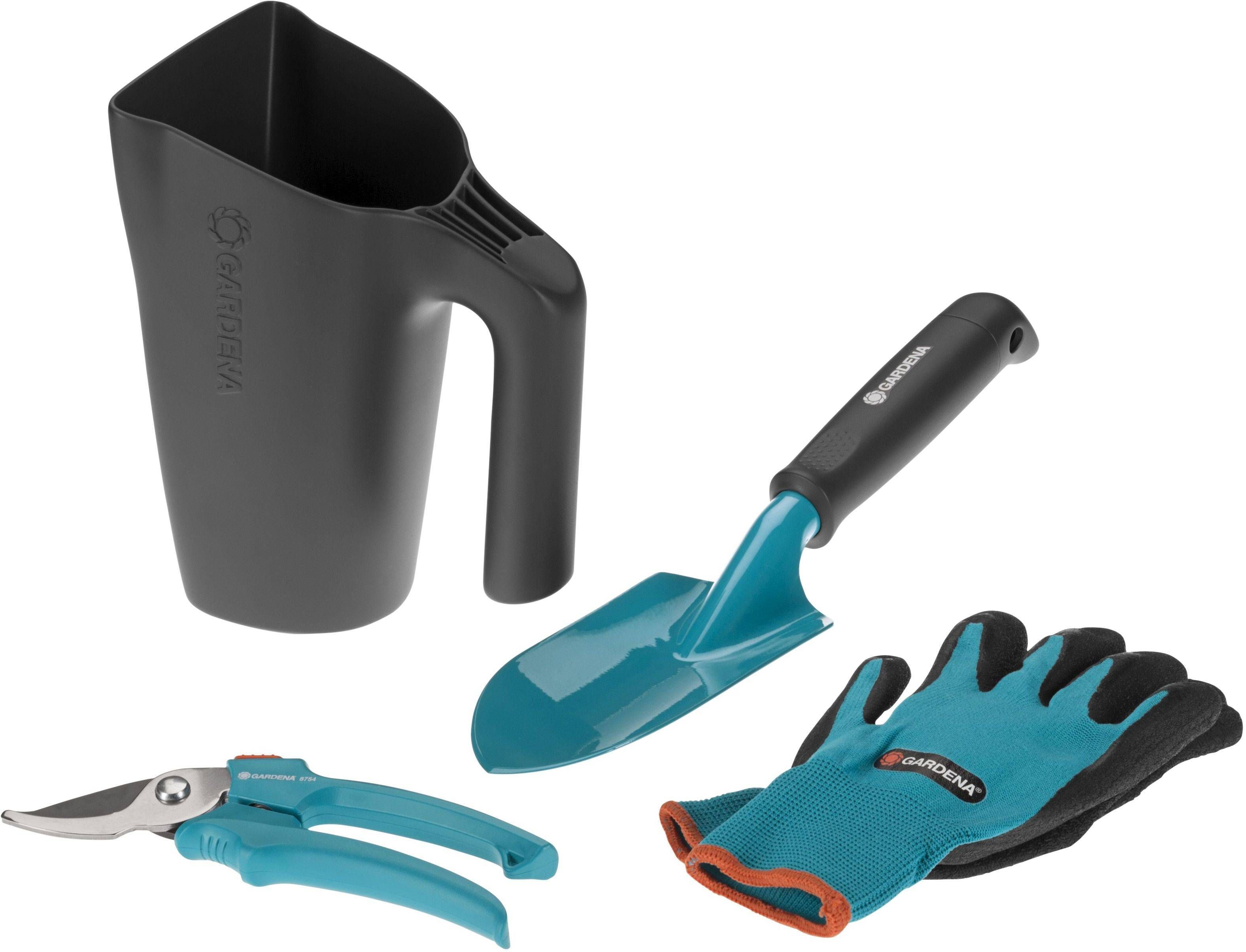 GARDENA käsitööriistade komplekt. Komplektis 8 cm istutuskühvel, istutuskindad suurus M, Classic oksakäärid ja praktiline kastmiskopsik.