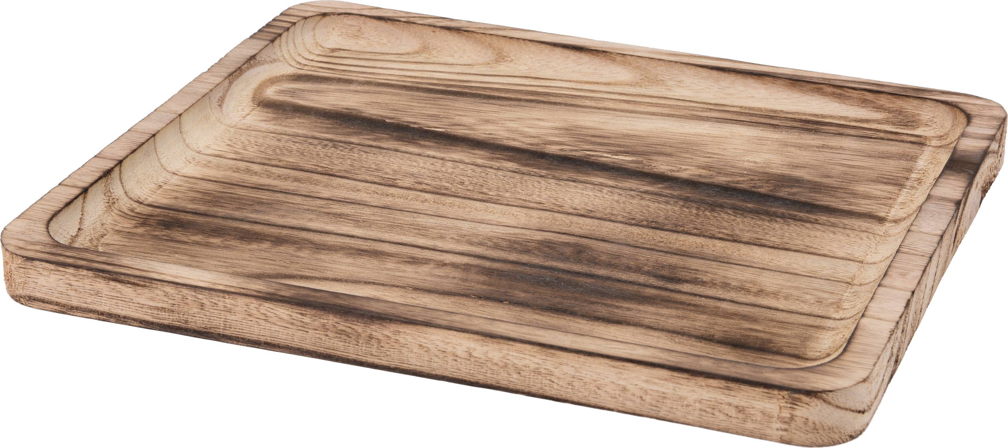 Nelinurkne puidust kandik, mille mõõtmed on 28 x 23,5 x 18 cm. Kandik on põletatud viimistlusega naturaalset puidutooni.