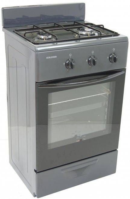 Schlosser F402G1G on hall, kahe gaasipõletiga ja gaasiahjuga pliit, mille sügavus on 44 cm. Ahjul on topeltklaasiga uks, termomeeter ukse klaasil, maksimaalne temperatuur 270°C. Kaasas grillrest, küpsetusplaat, lisadüüsid balloonigaasile. Reguleeritavad jalad.