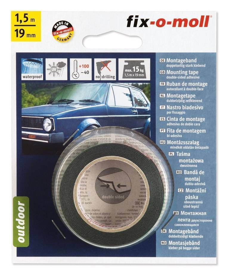 Fix-o-molli montaažiteip on kahepoolne, musta värvi ja sobilik välitingimustesse. Talub hästi UV-kiirgust, niiskust, õli ja lahusteid. Ideaalne siledatele pindadele: plaadid, akrüül, ka teras ja alumiinium. Teibi pikkus on 1,5 m, laius 19 mm.