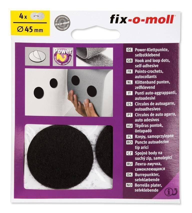 Fix-o-molli takjakinnitus on musta värvi ja isekleepuv. See on eriti tugev kinnitusdetail. Paigaldamisel puhastage enne pind. Kinnitage pehme pool alati eemaldatavale poolele. Maksimumtugevus 24 h pärast. Takjakinnituse läbimõõt on 45 mm. Pakis 8 tk.