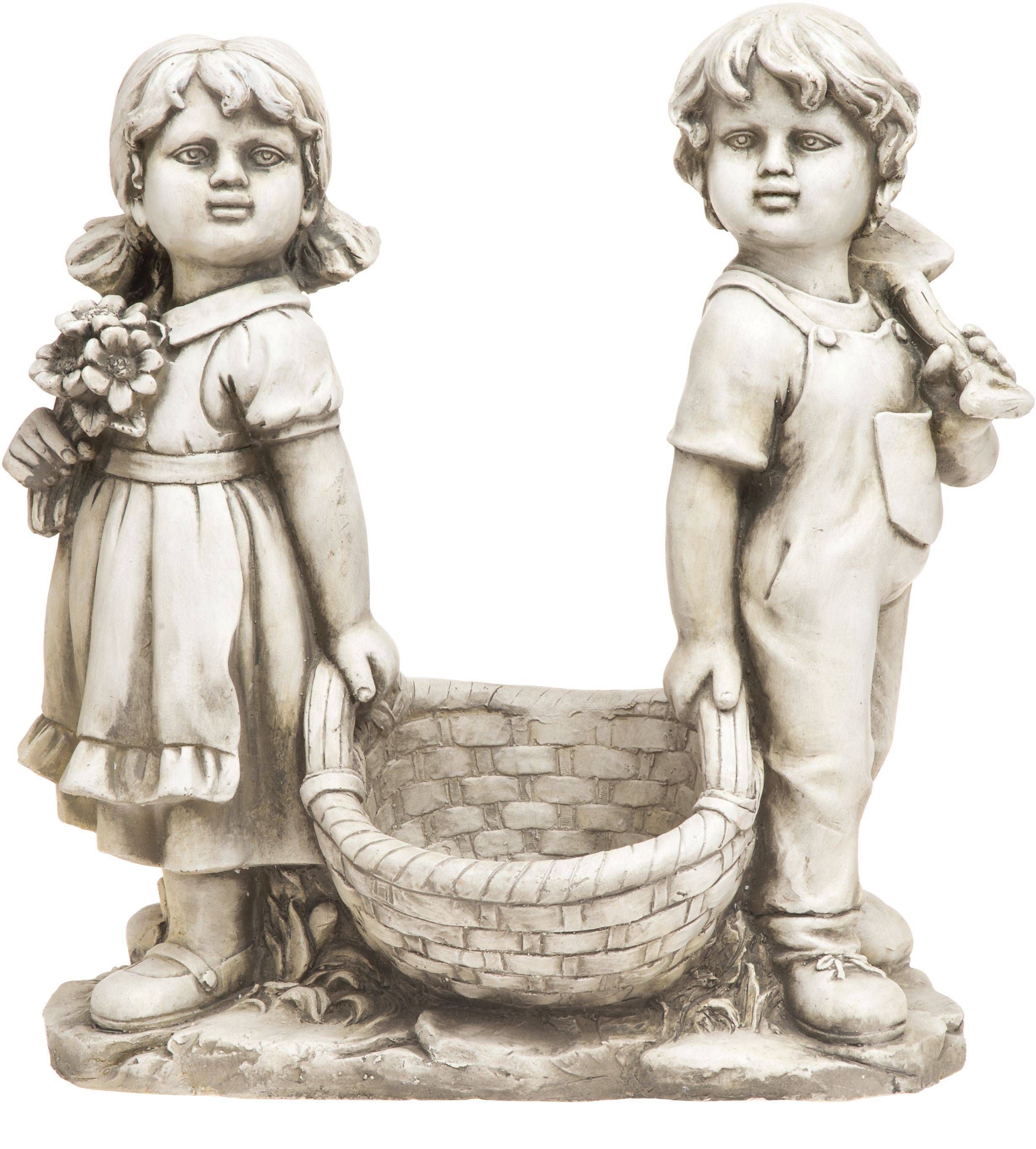 4LGardenDeco betoonkuju tüdrukust ja poisist, kes hoiavad korvi. Betoonkuju mõõtmed on 22 x 49 x 57 cm ning on antiikset valget värvi.