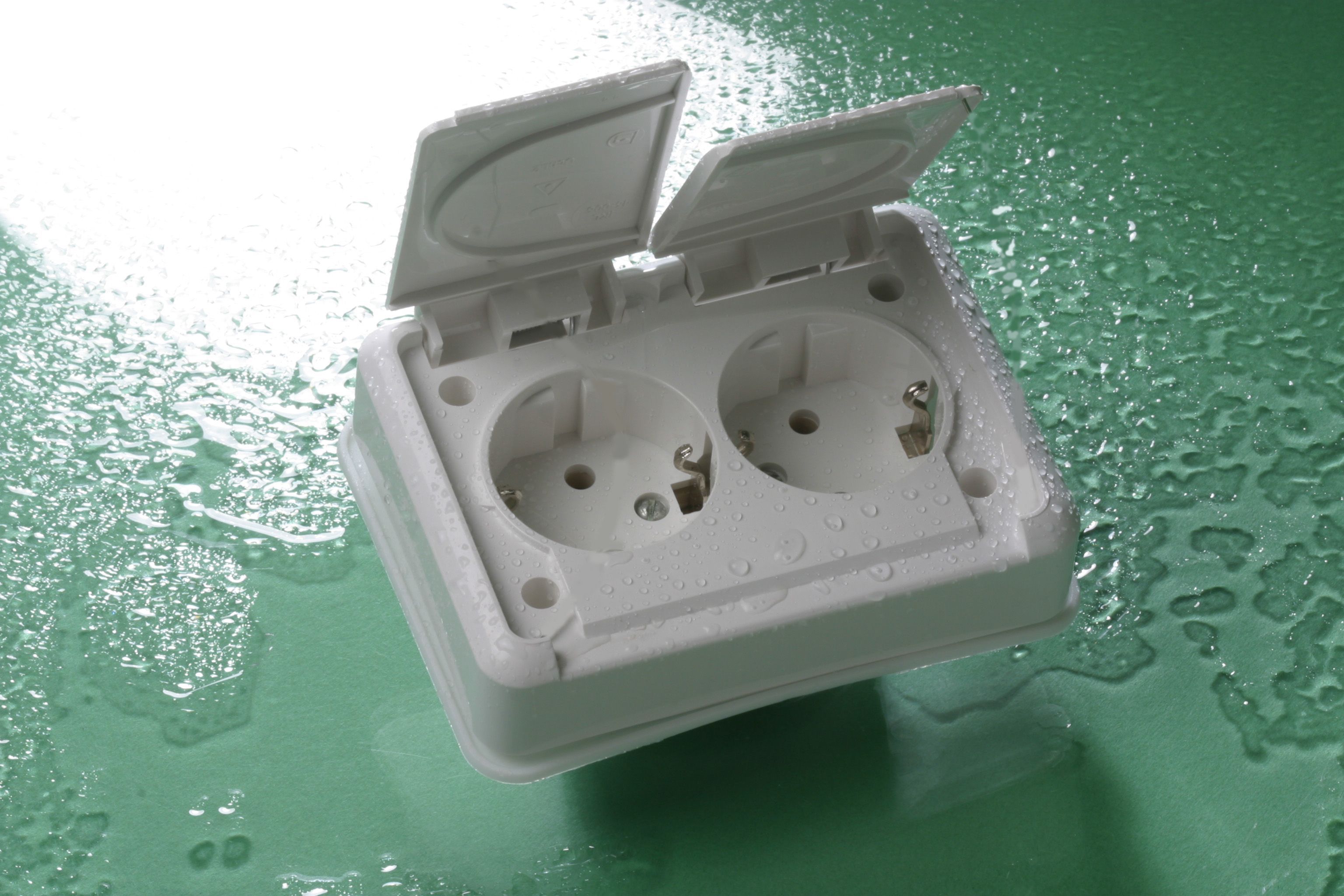 Liregus pistikupesa, millel on 2 pesa. Pistikupesa on maandusega, süvistatav ja niiskuskindel IP44. Pistikupesa on valget värvi.