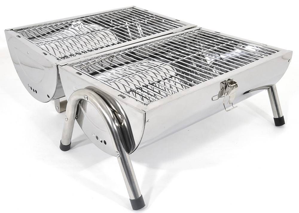Kahe poolega kohver-tüüpi söegrill on asendamatu kaaslane igal piknikul, matkal või kalastamisel. Grillimispainna mõõtmed on 2 x 34 x 22 cm. Grill on valmistatud kvaliteetsest terasest. Grillil on puidust käepide ja lukustatav kaas. Grilli mõõdud suletuna on 41 x 29 x 36 cm.