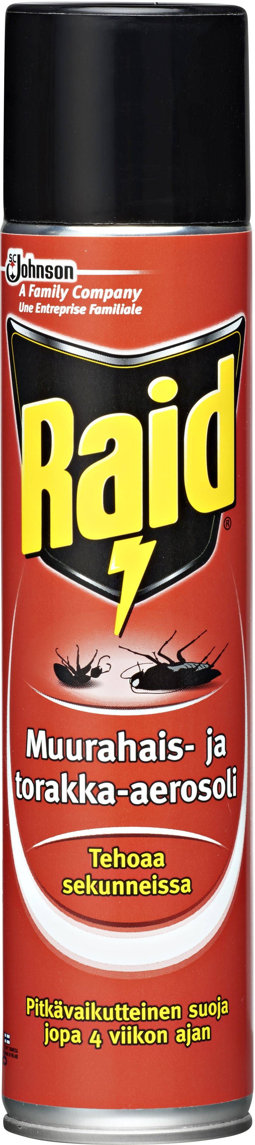 Raid putukatõrjevahend mõjub sipelgatele ja prussakatele ning nende munadele. Toode on mõeldud sipelgate ja teiste mittelendavate putukate tõrjeks siseruumides. Kasutamine muul otstarbel ja kasutusjuhendi vastaselt on keelatud. Enne kasutamist hoolikalt loksutada. Hoida pakend püstasendis. Pihusti suunata vajalikule pinnale ja vajutada nuppu ühtlase tugevusega. Töödelda mittelendavate putukate liikumisteid, liikumis- ja peidupaiku, näiteks kappe, prügikaste, aknaid ning ukselenge, pragusid ja sooni. Pikaajalise mõju tagamiseks pihustada aerosooli putukate liikumisteedele, peidukohtadesse, seina ja aknapragudesse. Pindu töödelda umbes 30 cm kauguselt (u 5 sekundit jooksva meetri kohta). Tuulutada töödeldud ruume 15 minutit pärast töötlemist. Käitlemisel täita ohutusnõudeid! Sisaldab biotsiidi. Enne kasutamist tutvuda kasutusjuhendiga.