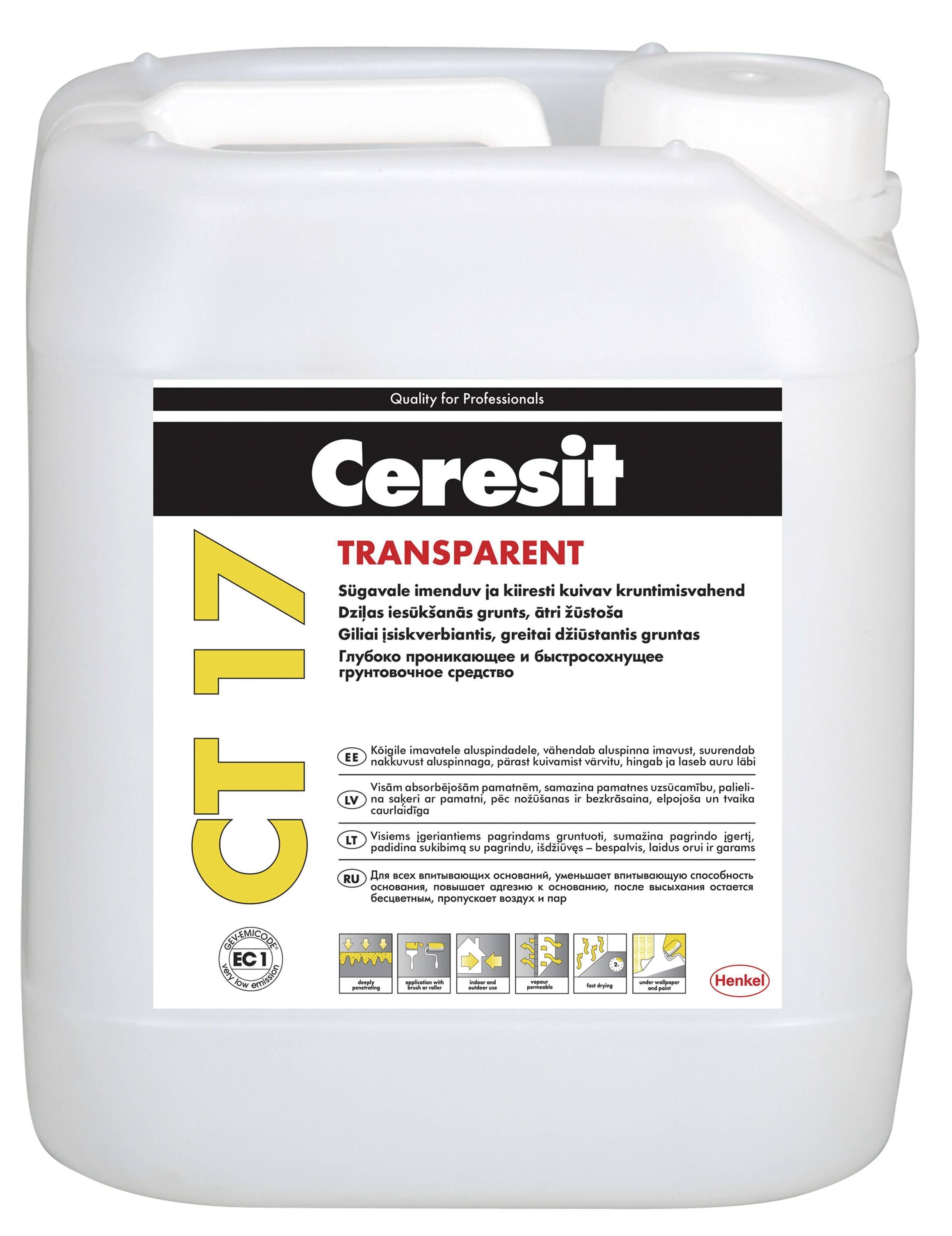 Ceresit CT 17 Transparent on ette nähtud nii hoonete sise- kui ka välispindade (seinad, põrandad, laed) kruntimiseks, kuhu hiljem kinnitatakse keraamilised plaadid, soojusisolatsiooni- või põrandakattematerjalid, valatakse tasanduskihid või mida tapeeditakse, pahteldatakse ning värvitakse. Kruntimisvahend ei sisalda lahustit. Vahendiga Ceresit CT 17 Transparent krunditud aluspinnad (igat liiki krohv, betoon, valatud tsementaluskihid, köetavad põranda aluskihid) on väiksema imavusega ning see takistab hiljem pealekantavate plaatimissegude, vahekihtide, pahtli- või värvikihtide liiga kiiret kuivamist. Vahend imbub sügavale aluspinna sisse ja seob omavahel täiteainegraanuleid, mis tugevdab aluspinda pindmiselt. Kruntimisvahendi Ceresit CT 17 Transparent kasutamine kiirendab tööde käiku.