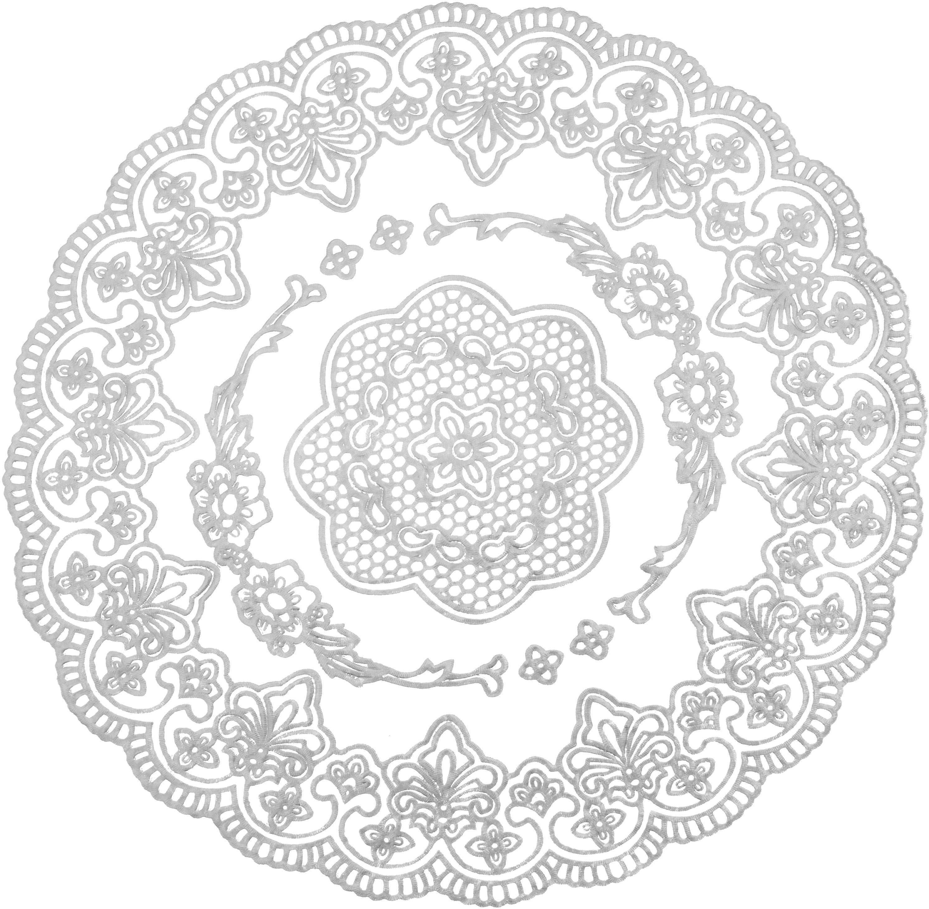 4LCollection pitsiline hõbedane ja ümmargune lauakate on läbimõõduga 36 cm.