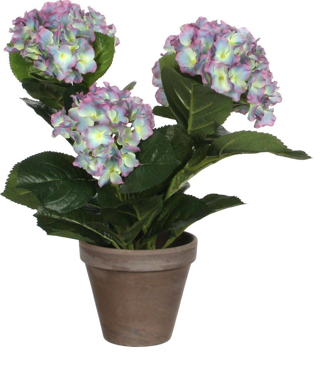 Mica Decorations potis kunstlill hortensia. Lill on mõõtmetega 35 x 40 cm ning pott on läbimõõduga 13,5 cm. Roosat värvi.