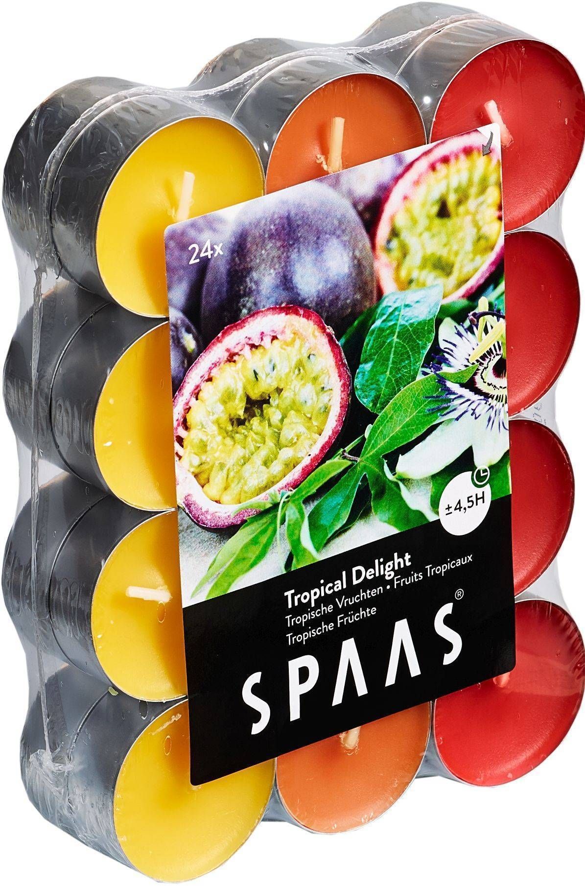 Spaas lõhnastatud teeküünal on trendikas ja värviline lõhnaküünal, mis tekitab positiivseid emotsioone sinu kodus. Küünal on kauakestev ja põleb heleda ja ilusa leegiga. Troopiliste viljade lõhnalise teeküünla põlemisaeg on ca 4,5 tundi, topsi läbimõõt on 39 mm. Pakis 3 erinevat tooni, kokku 24 tk.