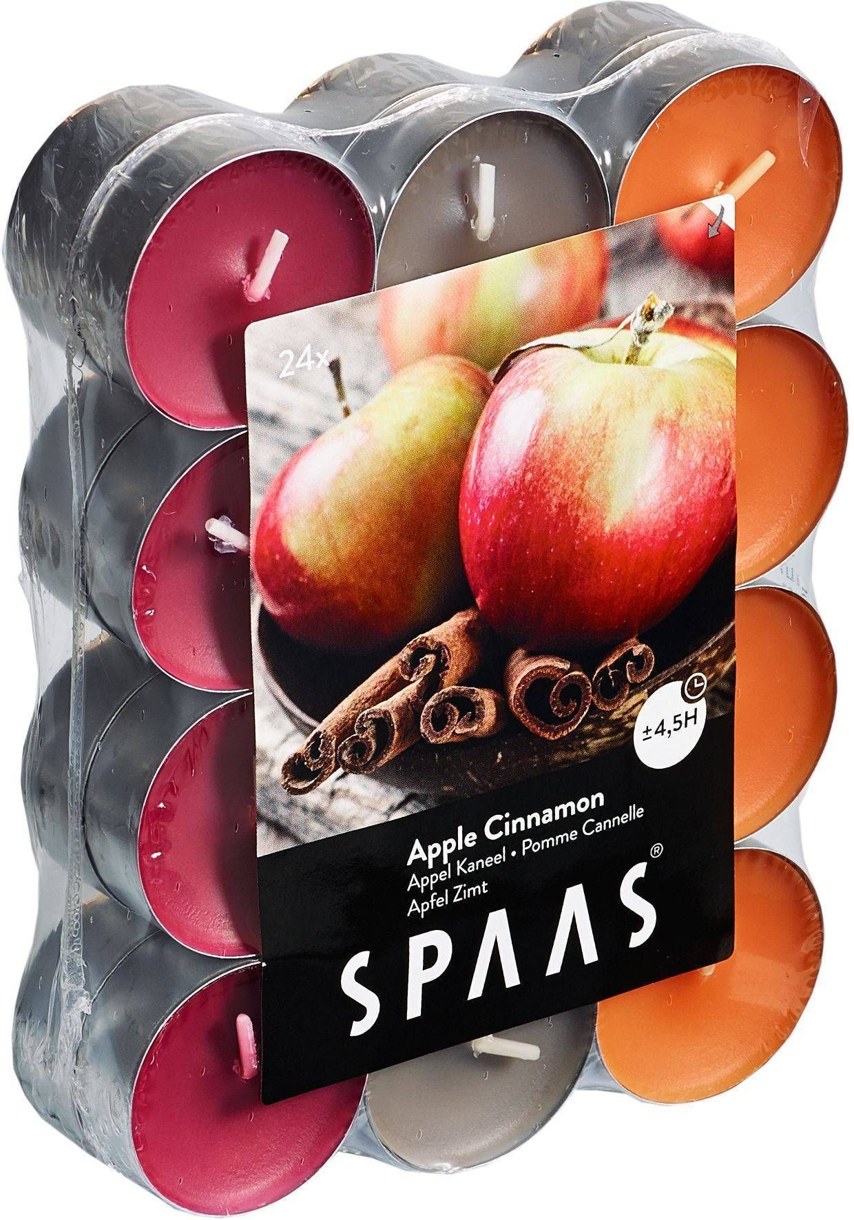 Spaas lõhnastatud teeküünal on trendikas ja värviline lõhnaküünal, mis tekitab positiivseid emotsioone sinu kodus. Küünal on kauakestev ja põleb heleda ja ilusa leegiga. Õuna-kaneeli lõhnalise teeküünla põlemisaeg on ca 4,5 tundi, topsi läbimõõt on 39 mm. Pakis 3 erinevat tooni, kokku 24 tk.
