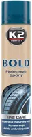 Sensatsiooniline silikoonpolümeeride baasil valmistatud K2 hooldus- ja puhastusvahend Bold rehvide hooldamiseks ning kvaliteetse läike andmiseks. Lihtne kasutada, ei jäta plekke ning tagab rehvidele pikaajalise kaitse tuhmumise, pleekimise ja pragunemise eest. Isegi vanad ja kulunud rehvid näevad töötlemise järgselt välja nagu uued. Sobilik kõikidele rehvitüüpidele.