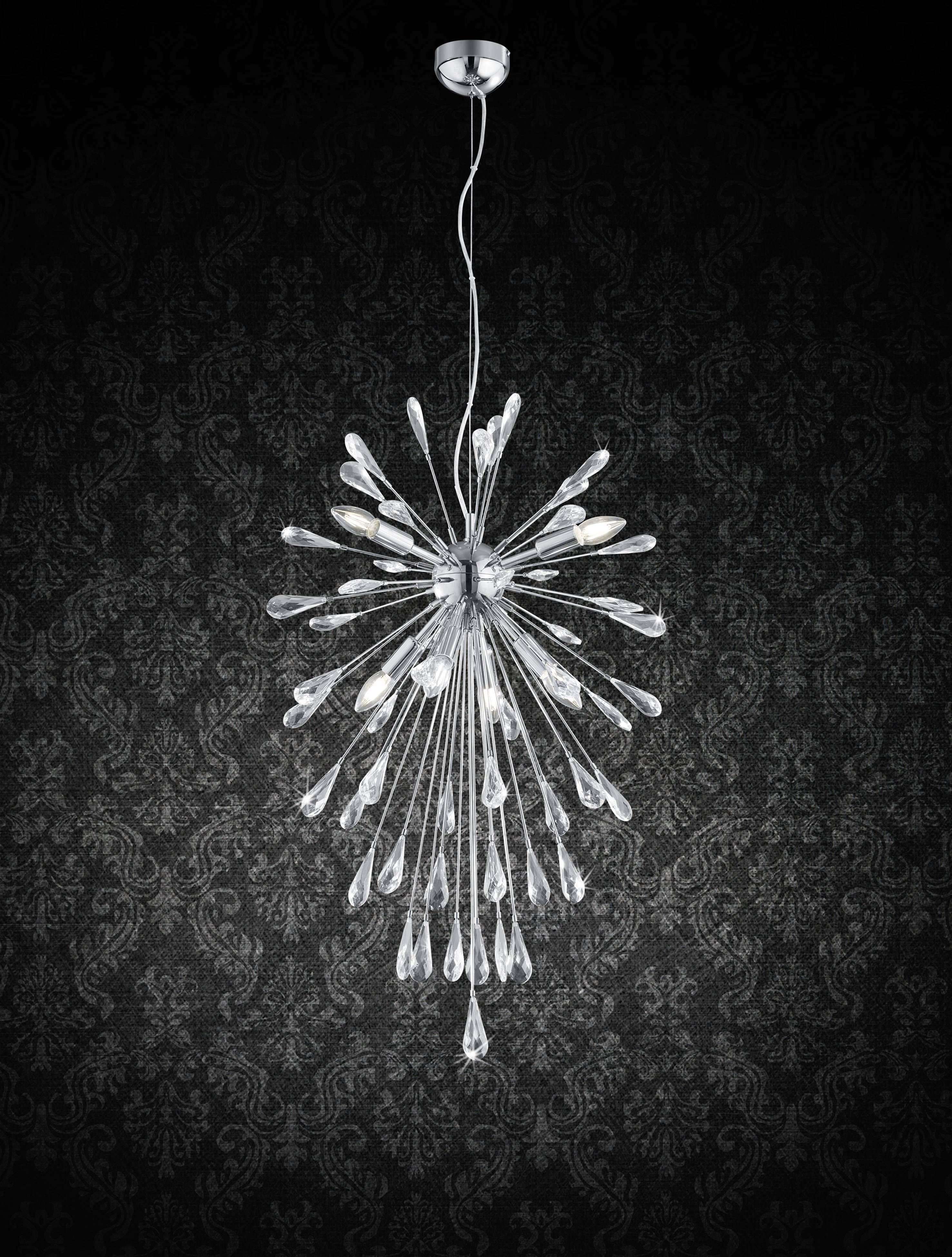 • Laelambil on 7 x E14 soklit max 28 W (valgusallikad ei kuulu komplekti). • Diameeter on 50 cm ja kõrgus 150 cm. • Valgusti korpus on kroom viimistlusega ja dekoratsioonid läbipaistvast plastikust. • 14-päevane tagastusõigus.