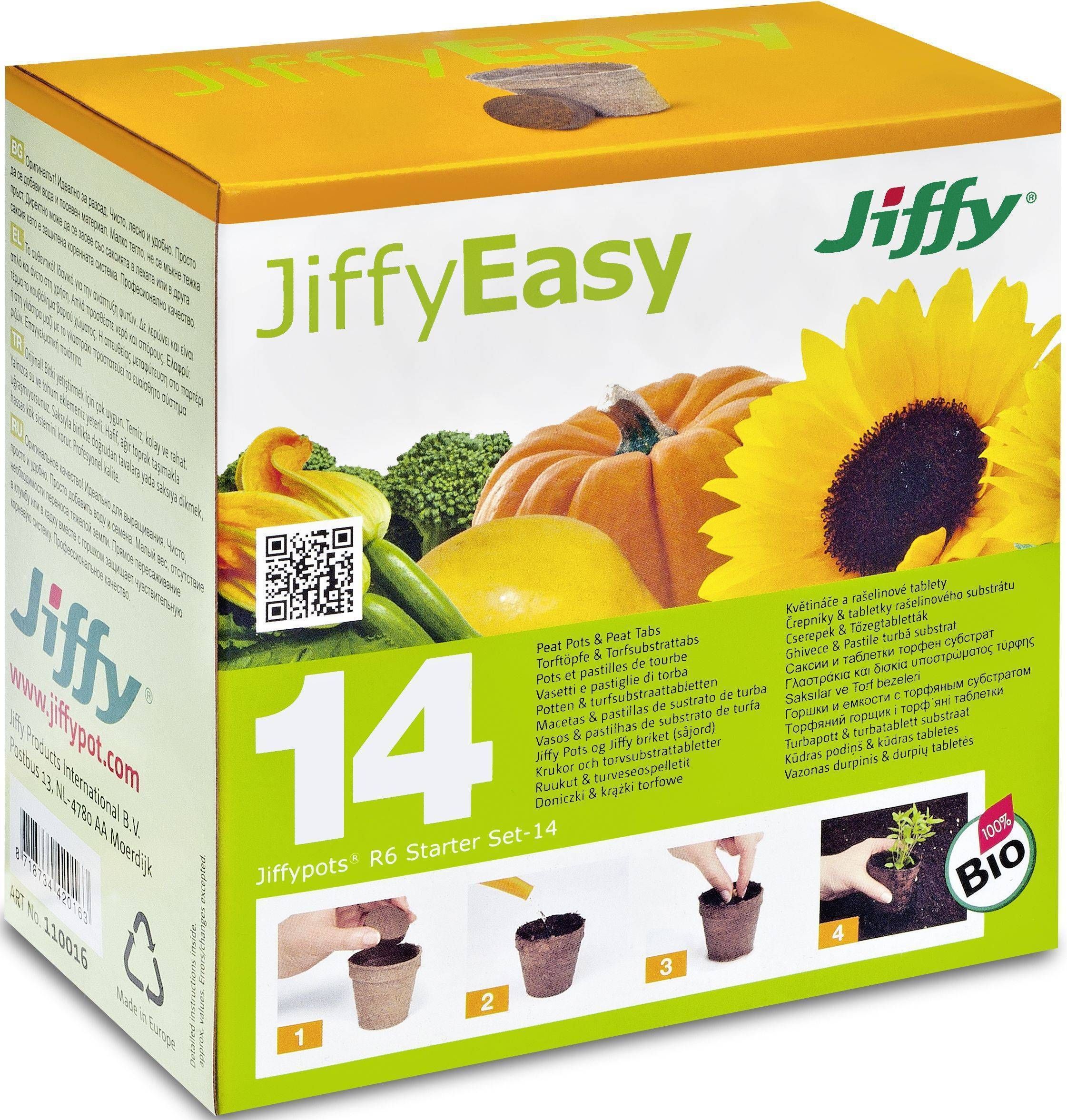 Jiffy komplekt sisaldab 14 turbapotti 6 cm läbimõõduga ja 14 QSM pressitud turbatabletti taimede ettekasvatuseks. Lisada tabletile 50 ml vett ning saate ühe turbapoti täie valmis substraati. Turbapotid on 100% biolagunevad.