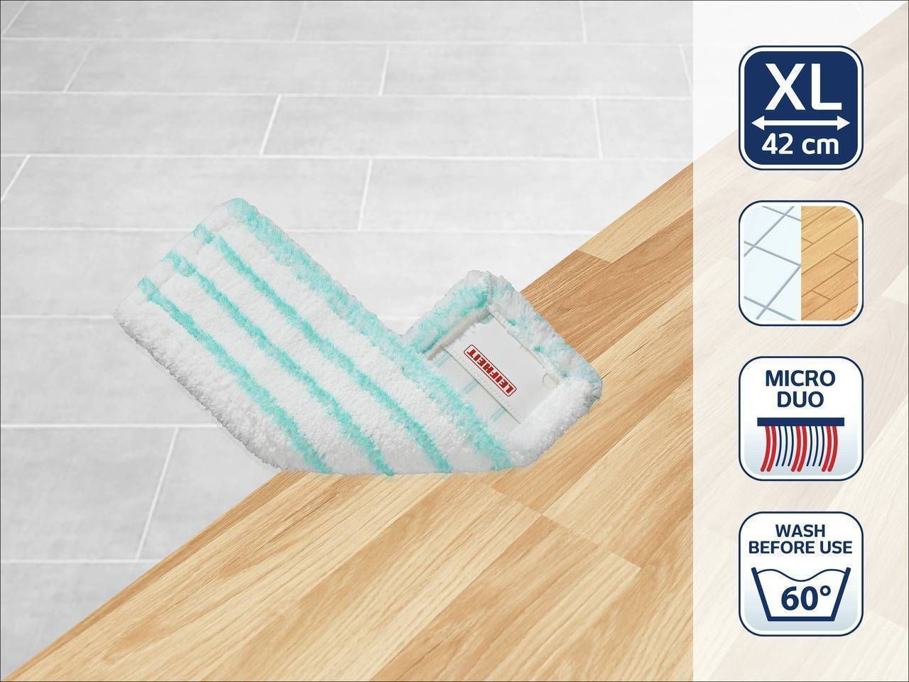 Leifheit põrandapesija kate Profi MicroDuo, volditud. Põrandapesija vahetuskate on valmistatud spetsiaalsetest kahe erineva tugevusastmega kiududest, mis tagavad eriti suurepärase puhtuse. Micro Duo kate on disainitud selliselt, et katte kiud asetsevad kahel eri tasandil, mistõttu ulatuvad need ka erinevate pindade vahedesse ning puhastavad mustuse kerge vaevaga. Mikrofiiberkiud imavad mustuse ja pesuvee kiirelt ja efektiivselt. Profi Micro Duo vahetuskate on masinpestav 60°C juures ning selle head puhastusomadused ei muutu ka korduval pesemisel. Enne esimest kasutuskorda soovitame katet pesta, et tagada paremad tooteomadused. Mitte kasutada pesuloputusvahendit. Micro Duo mikrofiiberkiududest põrandapesija on sobilik kasutamiseks nii kivipõrandatel kui ka puit- ja laminaatpõrandatel. Tänu oma 42 cm katte laiusele on Profi põrandapesija sobilik ka suurte põrandapindade puhastamiseks, säästes sellega sinu energiat ja aega. Põrandapesija katte saad eemaldada Profi põrandapesija käepidemelt ühe lihtsa jalavajutusega ilma kummardamata (käepide ei kuulu komplekti).