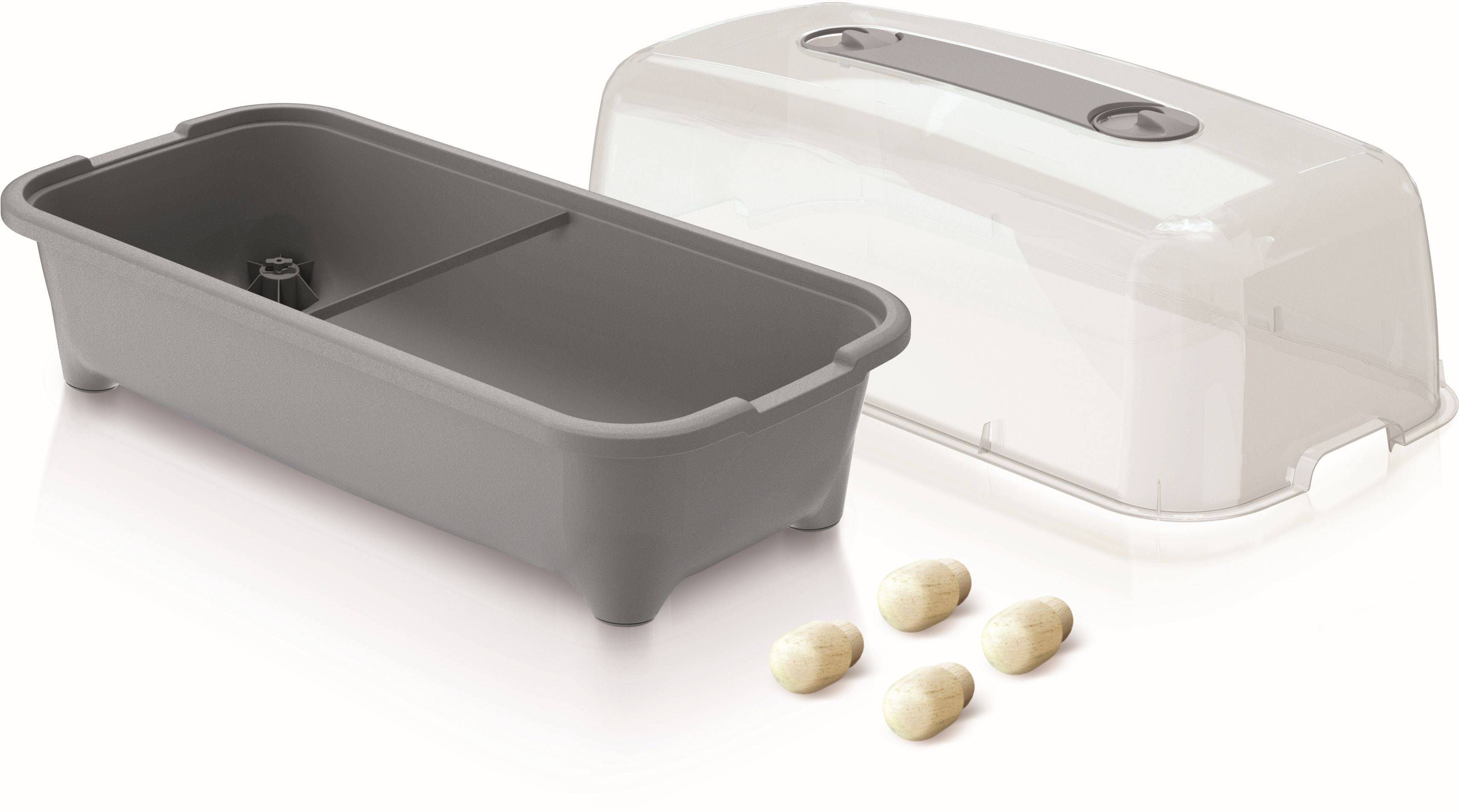 Prosperplast plastikust rõdukast madalatel jalgadel. Kast on varustatud läbipaistva kaanega, mille küljes on reguleeritav ventilastiooniava, mis võimaldab luua ideaalsed kasvutingimused taimede kasvamiseks. Kast on halli värvusega ja mõõtmetega 78 x 37,9 x 43,5 cm.