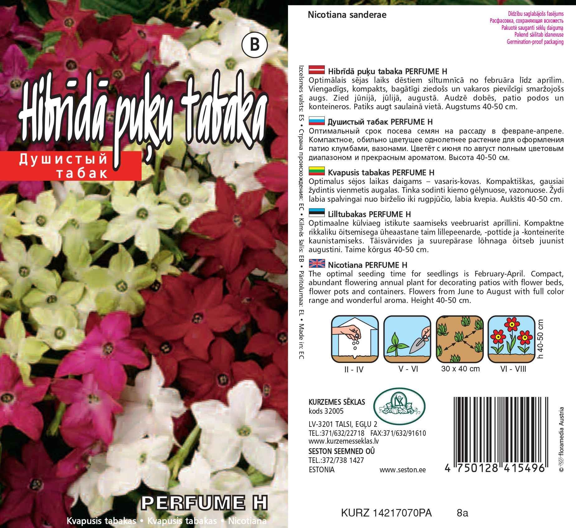 Kurzemes Sēklas lilltubakas Perfume F1 on kompaktne rikkaliku õitsemisega üheaastane taim lillepeenarde, -pottide ja -konteinerite kaunistamiseks. Optimaalne külviaeg istikute saamiseks on veebruarist aprillini. Täisvärvides ja suurepärase lõhnaga õitseb juunist augustini. Taime kõrgus 40-50 cm.