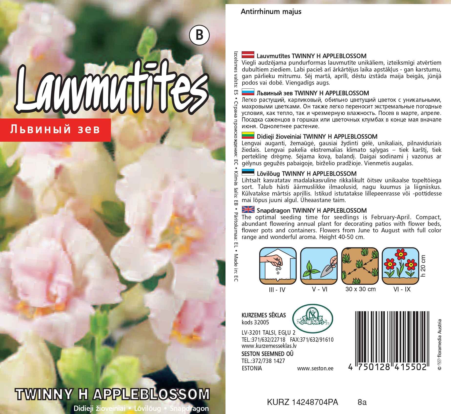 Kurzemes Sēklas lõvilõug Twinny F1 Appleblossom on lihtsalt kasvatatav madalakasvuline rikkalikult õitsev unikaalse topeltõiega sort, üheaastane taim. Talub hästi äärmuslikke ilmaolusid, nagu kuumus ja liigniiskus. Külvatakse märtsis aprillis ja istikud istutatakse lillepeenrasse või -pottidesse mai lõpus juuni algul.