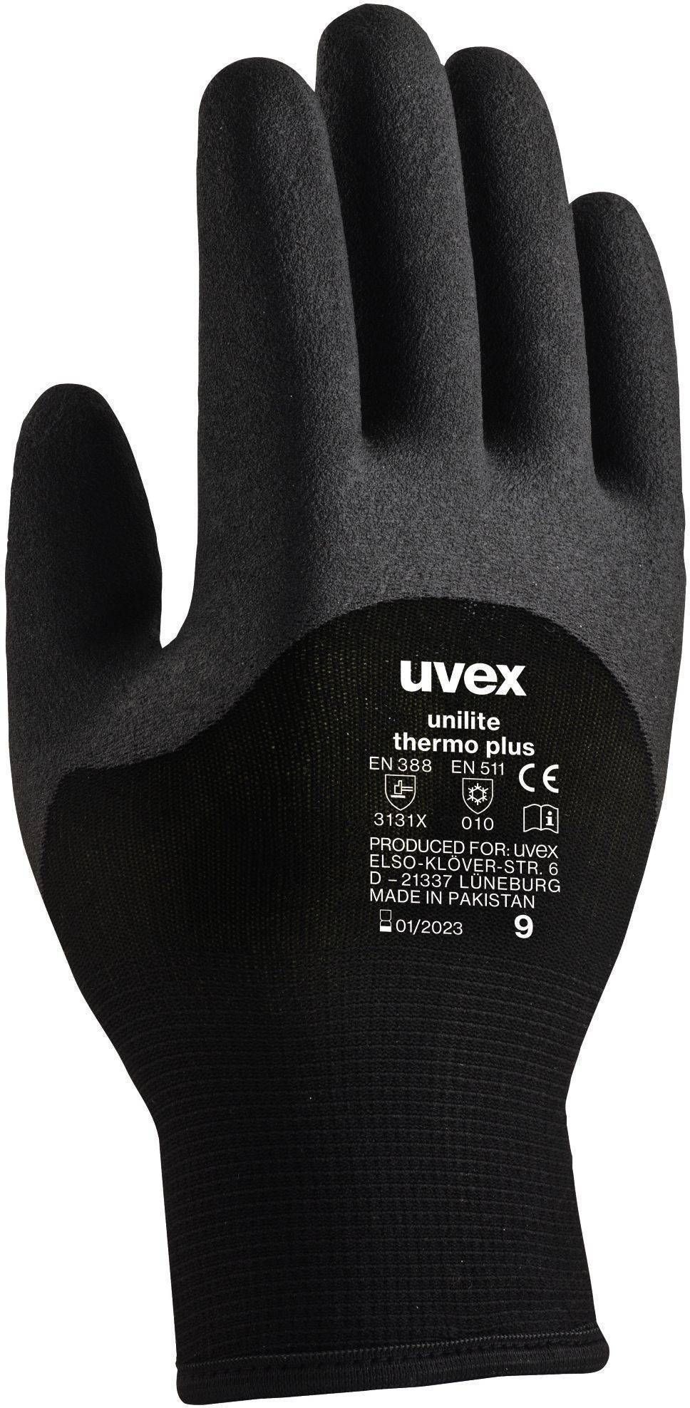 Uvex Unilite Thermo Plus mustad töökindad on mugavad ja pehmed ning pakuvad kaitset kätele külmades töötingimustes. Töökindad on valmistatud kahekihilisest akrüülvillast, 3/4 käelaba katab polümeerkiht. Kinnastel on väga hea soojusisolatsioon ja hea haarduvus kuivades ja kergelt niisketes piirkondades. Töökeskkondadeks sobivad betoon/ehitustööd, ladu/kauplused ja külm keskkond. Sertifikaadid: EN 388 (3 2 3 1) ja EN 511 (0 1 0). Suurus 8.