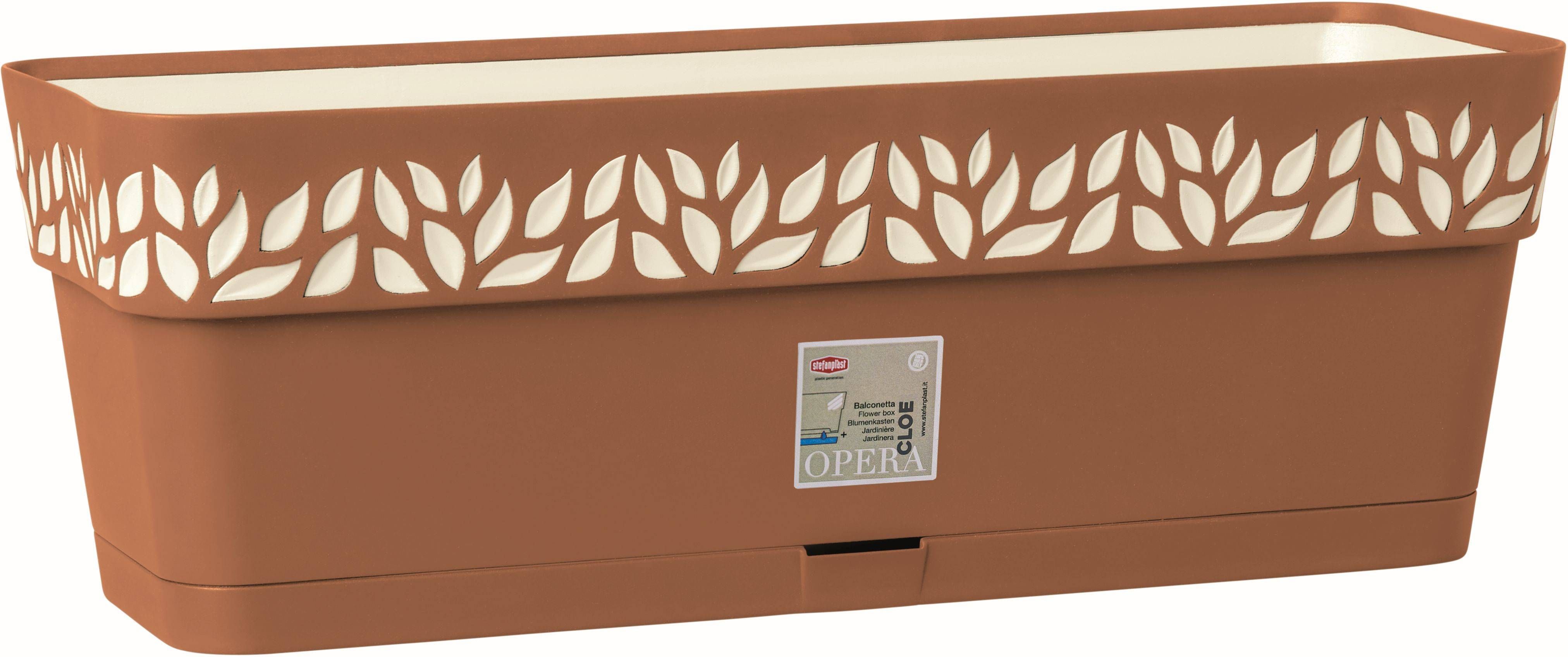 Mahuka altkastmisalusega ja ilmastikukindel dekoratiivne Elho rõdukast Cloe. Rõdukasti pikkus on 50 cm ja laius 18 cm, värvus terrakotta kreemikate lehtedega. Rõdukasti lehemuster on toodetud uue tehnoloogiaga, sissepoole pressides. Mahutab substraati 9,5 liitrit.