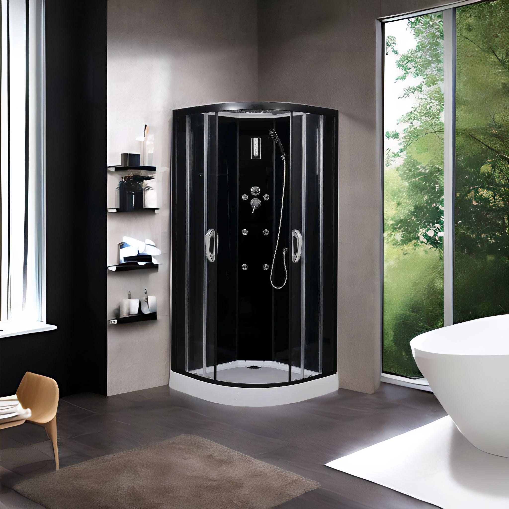 • Madala alusvanni, liuguste ja katusega massaažikabiin, mille mõõtmed on 90 x 90 cm, kõrgus 220 cm. • Uksed ja esisein on 5 mm kirkast turvaklaasist, tagasein must. Alumiiniumprofiil on värvitud must. • 6 seljamassaaži düüsi, segisti, üla- ja käsidušš. Lisaks juhtpult, valgustus, raadio, ventilaator ning riiul. • Metallraamil valge akrüülvann, mille kõrgus on 13 cm. • 14-päevane tagastusõigus.